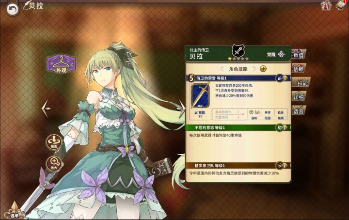 各位店主早上好呀~今天给大家介绍的是一位低攻击力高坦度的战士,R稀有度的贝拉。 R 贝拉(战士) 主线推荐度:★★★★☆排名战推荐度:★★★☆☆PVP推荐度:★★★★☆ 贝拉的奥义“侍卫的荣誉”可以立即回复自身的生命值,而且减少下一次受伤的伤害值,满级时可减伤35%。技能“不屈的意志”让贝拉在每次使用武器时恢复生命值,满级时可恢复300点生命值,并且在使用奥义后清除自身燃烧、中毒、
