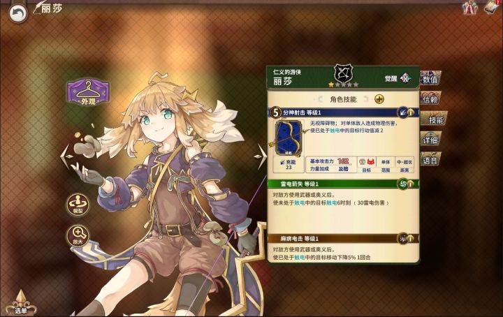 店主早上好~今天带给大家分享一位R稀有度的射手,能造成感电效果的丽莎。 R 丽莎(射手) 主线推荐度:★☆☆☆☆排名战推荐度:★★★★★(辅助萝塞塔)PVP推荐度:★★★★☆(麻痹对手) 奥义“分身射击”让丽莎无视障碍物,对单体敌人造成物理伤害的同时降低触电目标行动值(满级减3)。技能“雷电箭矢”能让敌方挂上触电状态。技能“麻痹电击”可以使处于触电中的目标移动下降(满级时下降15%