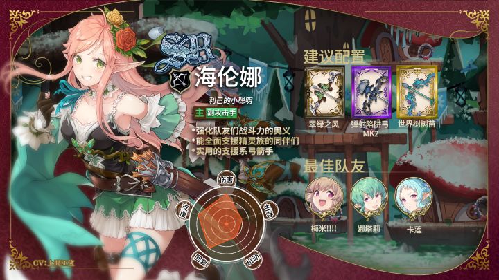 全新SR店员-利己的小聪明·海伦娜登场!职业:弓cv:上間江望因为梅米突然的离开,而被孤单的遗忘在灵芙村,梅米的青梅竹马。在梅米突然回来的现在,决定要用尽一切办法让梅米留下来!充满小聪明的海伦娜能够在战场上配合精灵族的队友,为精灵族的队友带来增益,提升队伍的战斗能力!活动角色「利己的小聪明 海伦娜」美术设定公开,在树林中闪过的绿影,为同伴带来源源不绝的活力!