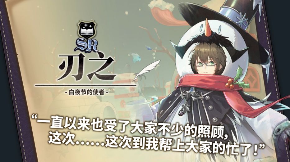 利用雪人的力量疗愈大家! 全新SR店员-「白夜节的使者 刃之」即将登场! 职业:书 特色:超强回复能力;增强防御力;增强队伍机动性。
