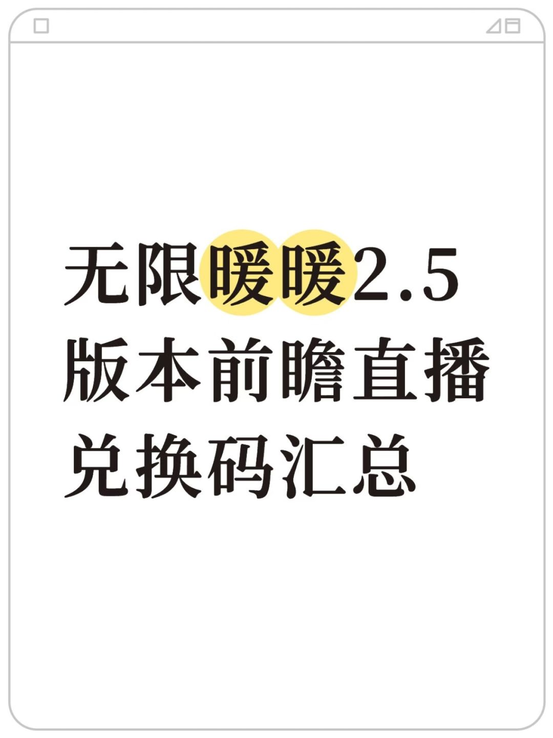 #无限暖暖 #无限暖暖攻略 #无限暖暖全球公测 终于终于要开服了!!!星星眼[表情_星星眼]星星眼[表情_星星眼]星星眼[表情_星星眼]星星眼[表情_星星眼]星星眼[表情_星星眼] 肯定有和我一样激动到什么都做不进去只想进游戏的暖妈,在游戏开始前的最后时刻,让我们一起再来回顾一下兑换码和活动等福利吧举手[表情_举手]举手[表情_举手]举手[表情_举手] 一.兑换码 1.官方发布 infinity