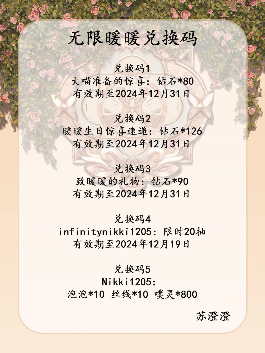 1.暖暖生日惊喜速递 (126钻石头)【12月31日晚上24点过期】 2.infinitynikki1205 (20限时启示水晶)【12.19上午10点过期】 3.大喵准备的惊喜 (80钻石)【12月31号晚上24过期】 4.致暖暖的礼物 (90钻石)【12月31号晚上24过期】 #无限暖暖 #无限暖暖拍照 #无限暖暖兑换码