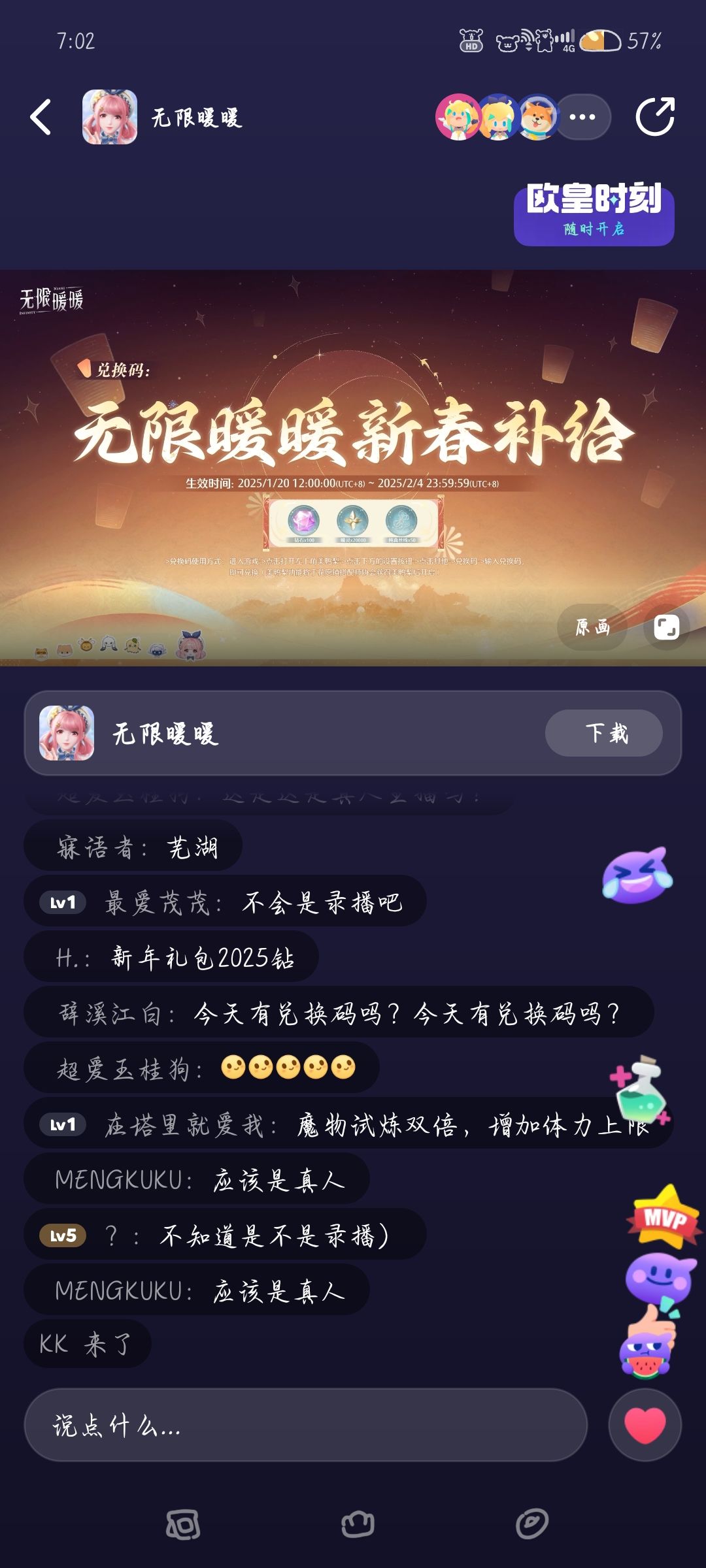 (祝大家都能抽到喜欢的衣服!)下面是兑换码 暖暖生日快乐2024 嘎嘎嘎嘎嘎嘎嘎 无限美好的开始 大喵准备的惊喜 暖暖生日惊喜速递 致暖暖的礼物 infinitynikki1205 Nikki1205 群里都是兄弟姐妹,管理员和群主会保持群内生态,不打广告不引战,有开服攻略等,欢迎各位想养女儿的加入我们。大家一起交流游戏,交友,交流心得啦。欢迎大家加入啦