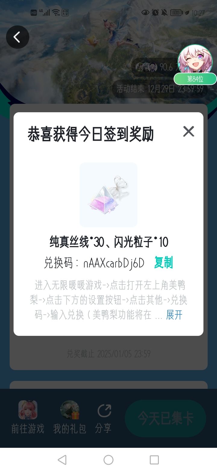 【infinitynikki1205】20个启示水晶,有效期:12月19日10:00 【暖暖生日惊喜速递】126钻石,有效期:12月31日23:59 【大喵准备的惊喜】80钻石,有效期:2024/12/31 23:59:59 【致暖暖的礼物】90钻石,有效期:2024/12/31 23:59:59 【Nikki1205】泡泡*10 丝线*10噗灵*800 #无限暖暖全球公测 #无限暖暖攻略征集