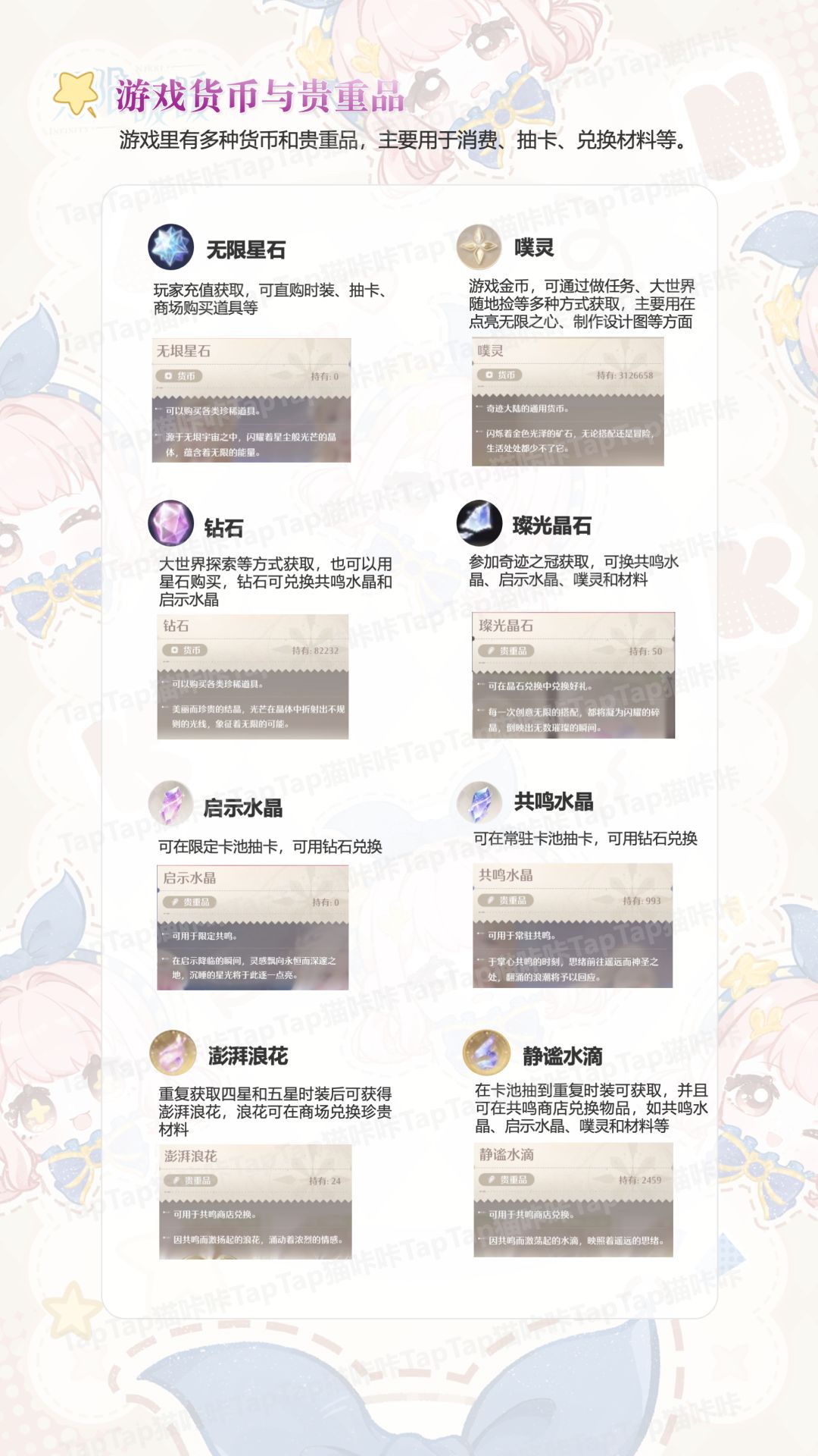很多萌新在进入《无限暖暖》后可能会一脸懵逼,因为这个游戏的内容实在太多辣! 今天猫咔就给大家介绍一些萌新需要了解的内容,以及玩游戏时的小技巧,帮助大家快速上手。 图/文:猫咔大王 本文首发TapTap,未经允许禁止转载 一、游戏货币与贵重品 游戏里有多种货币和贵重品,主要用于消费、抽卡和兑换材料等。 1、噗灵:游戏金币,可通过做任务、穿搭比拼、大世界随地捡等多种方式获取,主要应用在点亮无限之心、制