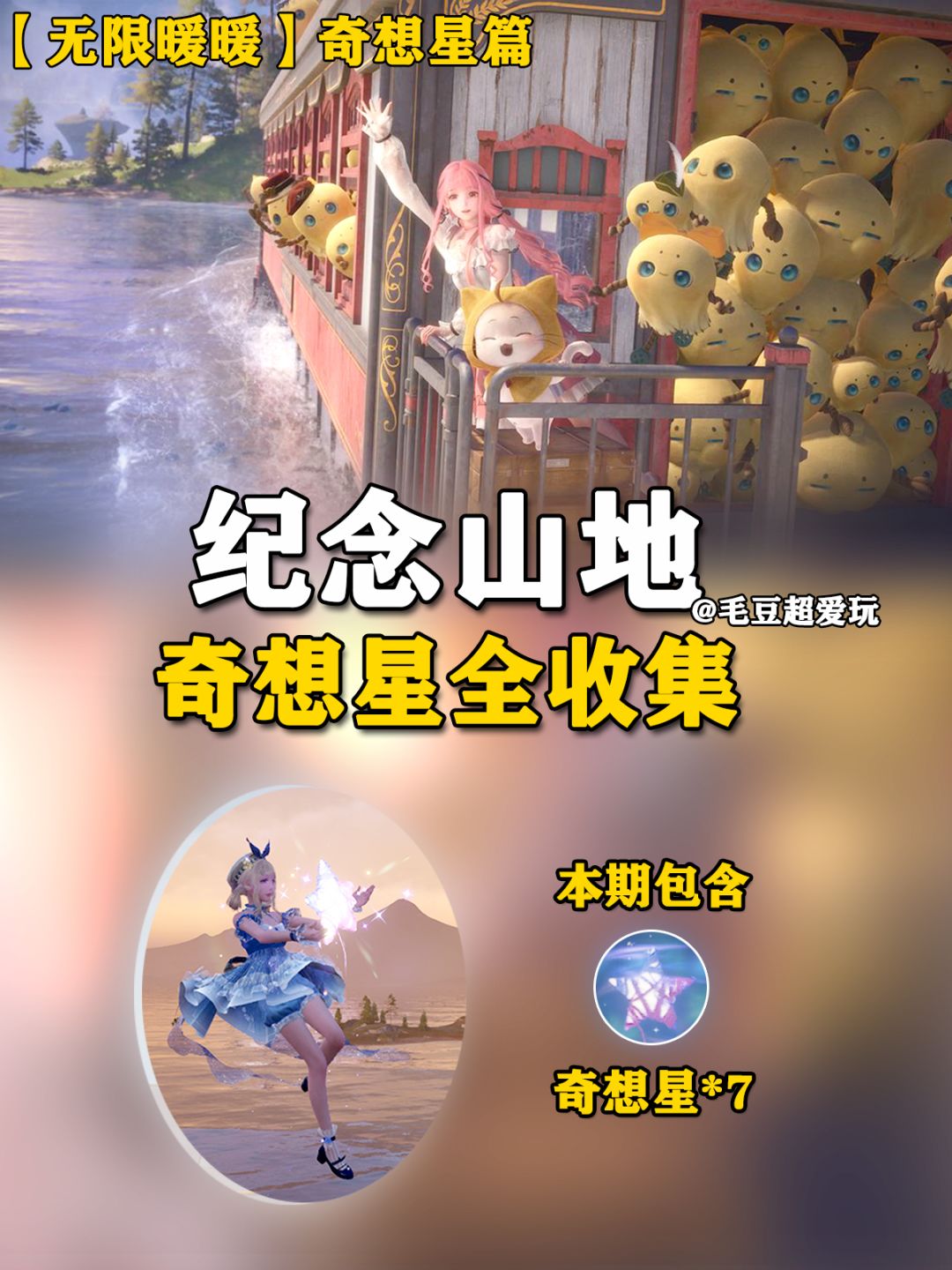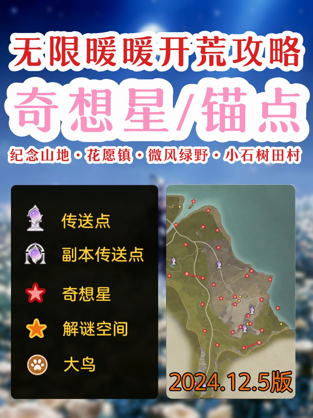 ✏️含 纪念山地·花愿镇·微风绿野·小石树田村 奇想星是核心收集元素 看见大喵的提示最好就去收哦 移动端点击画面左上角的大喵图案 PC端先按V 找到位置再按F 开图推荐在微风绿野骑个自行车 很好用! 本攻略的地图区域划分 和官方设定一致 但小片的ABC描述是自设的 只是为了更好展示 收集方式比较多样 路上可以多探索 如果有拿不到的可以评论区提问 ❗前期不推荐花噗灵买奇想星 长按图片选择“查看原图”