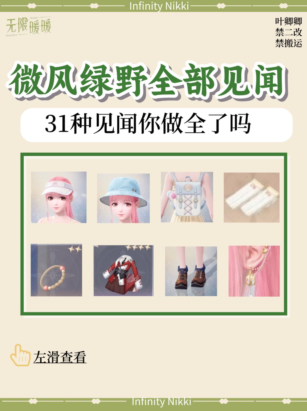 【微风绿野】31种全部见闻汇总 |完结所有的微风绿野见闻 这两天把花愿镇¦小石树¦无人区¦祈愿森林所有的见闻汇总表完结 那么见闻分成了经验类+点亮灵感【不给经验类】 进度汇报: 1.点亮灵感全图设计图纸已经完结【需要可见主页】 2.除花愿镇其余所有设计图图纸宝箱已完结【花愿镇电脑丢失了一部分还在核对整理中】 3.完结采集所有资源点位 后续计划 1.更噗灵怪位置 2.怪物点位 3.待补充【想看什么也