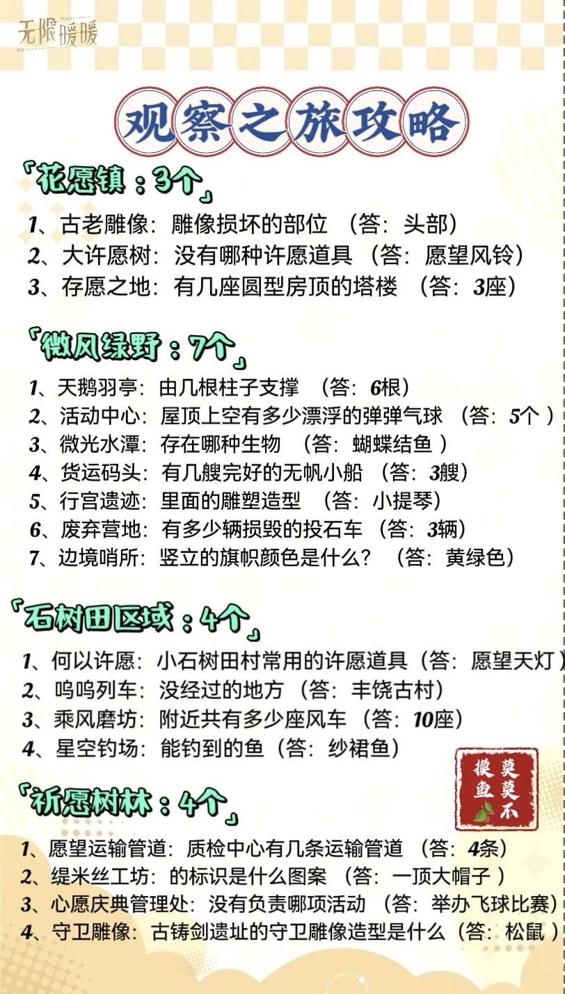 当前共计18个观察之旅见闻任务,全部答案攻略请查收;NPC都是阿文图拉,全部位置点地图,见后图 💚「花愿镇 3个」 1、古老雕像:雕像损坏的部位 (答:头部) 2、大许愿树:没有哪种许愿道具 (答:愿望风铃) 3、存愿之地:有几座圆型房顶的塔楼 (答:3座) 🩵「微风绿野 7个」 1、天鹅羽亭:由几根柱子支撑 (答:6根) 2、活动中心:屋顶上空有多少漂浮的弹弹气球 (答:5个 ) 3、微光水潭: