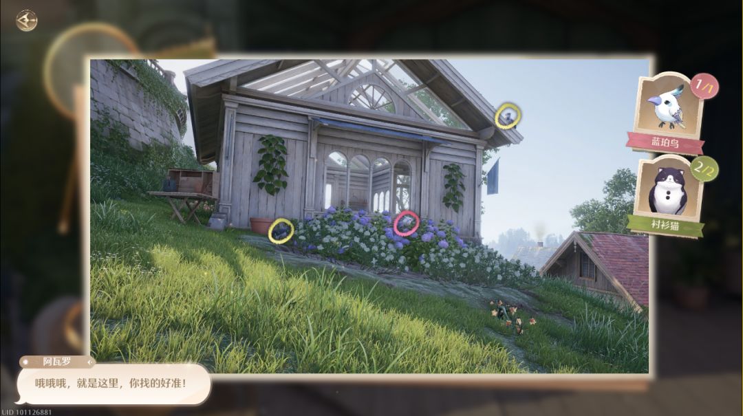 照片调查·动物的踪迹 地点:花愿镇 白天(5点-21点)的围兜狸猫欢笑俱乐部门口,动物摄影爱好者阿瓦罗在试图估算小动物的分布情况,帮他找出三张照片中的小动物们吧。 ❁与阿瓦罗对话,找出照片中的小动物 见闻奖励:10钻石 3升级包 照片调查·动物的踪迹:阿瓦罗NPC所在位置-如图所示 照片调查·动物的踪迹:与阿瓦罗NPC对话-如图所示(可以顺手跟面前的狸猫清洁可以获得-围兜毛球可用于设计图制作) 照