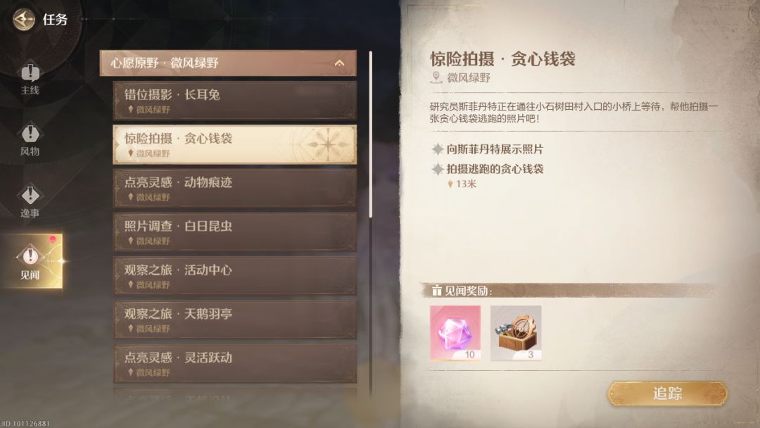 惊险拍摄·贪心钱袋 地点:微风绿野 研究员斯菲丹特正在通往小石树田村入口的小桥上等待,帮他拍摄一张贪心钱袋逃跑的照片吧! ❁向斯菲丹特展示照片 ❁拍摄逃跑的贪心钱袋 任务奖励:20钻石 3升级包 解锁条件:完成【见闻任务】惊险拍摄·丧气布袋 解锁方式:打开地图先使用使用流转之柱传送到绿野活动支援中心,随后朝箭头点位走 到达这个位置后即可解锁【见闻任务】惊险拍摄·贪心钱袋,接着跟斯菲丹特对话 贪心钱