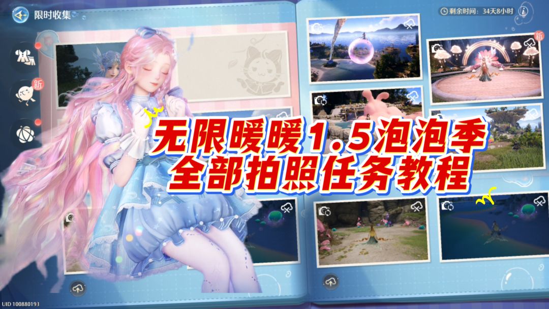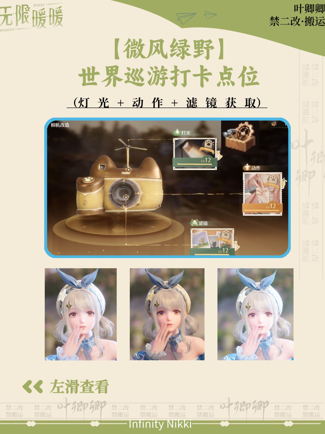 1、打开【相机】,右上角三个图标分别为【相机改造、世界巡游、相册】 2、通过【世界巡游】打卡,可以获取【相机改造】的【升级包】,也可通过完成探索拍照(例如福鸣之井)获取 【升级包】 3、通过【相机改造】升级,可以获取更多的【灯光、动 作、滤镜】 *世界巡游必须【完整拍下】【打卡提示】才算成功 *探索大世界时,出现【打卡提示】时尽量马上拍下,以免日后忘记。 *打卡大地图还在制作中 #无限暖暖攻