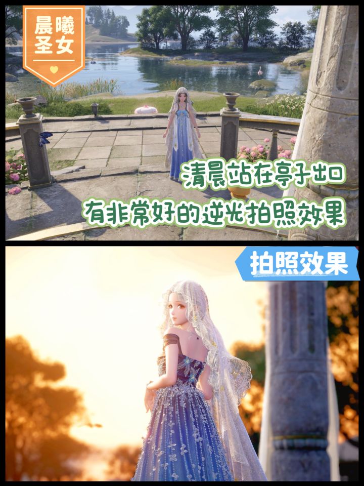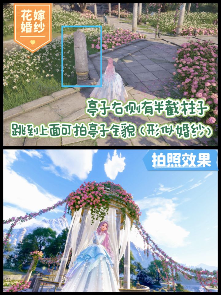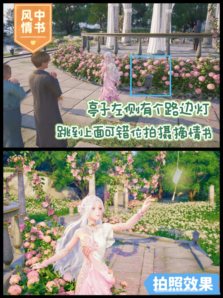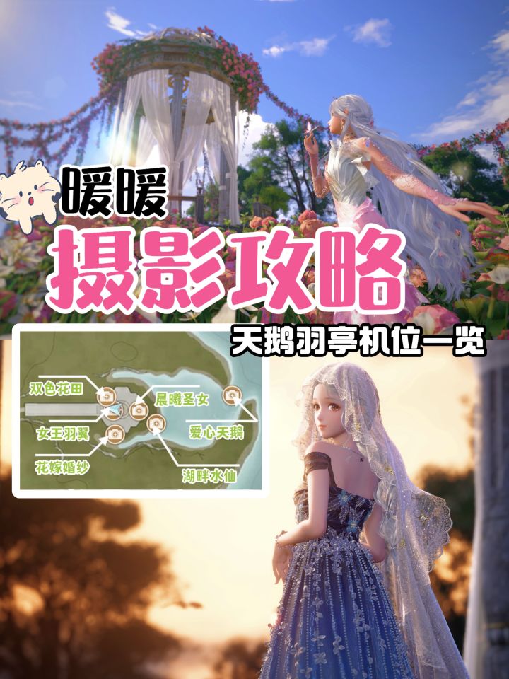 天鹅羽亭附近有好几处容易出片的机位,这边总结一下出片小技巧:①亭子入口两侧花田这个位置适合拍以花为背景的照片焦距调大即可去掉背景中多余的元素站在亭子左边的花田,焦距调小,镜头距离调近,配合仰视镜头可拍亭子(效果如封面)②亭子左侧路边灯亭子的左边有个很矮的路边灯,可以跳上去(虽然矮,但还是二段跳滞空比较好跳)然后镜头转向花藤上挂着的情书,选择伸手的动作即可拍出摘情书的效果③亭子右侧的