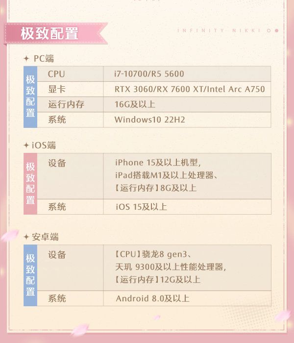 无限暖暖配置要求安卓的最低要骁龙888或天玑8200运行内存要6g以上,苹果的则是11以上,运行内存4g以上你想要你想要开到极致的话,安卓的话要骁龙8gen3破天玑9300以上,运行内存要12g,苹果则是15以上运行内存8g这样这要个人感觉还是有点高啊#无限暖暖 #好想玩无限暖暖 #今天游戏圈发生了啥 #游戏资讯 #难说话说 #资讯评论员