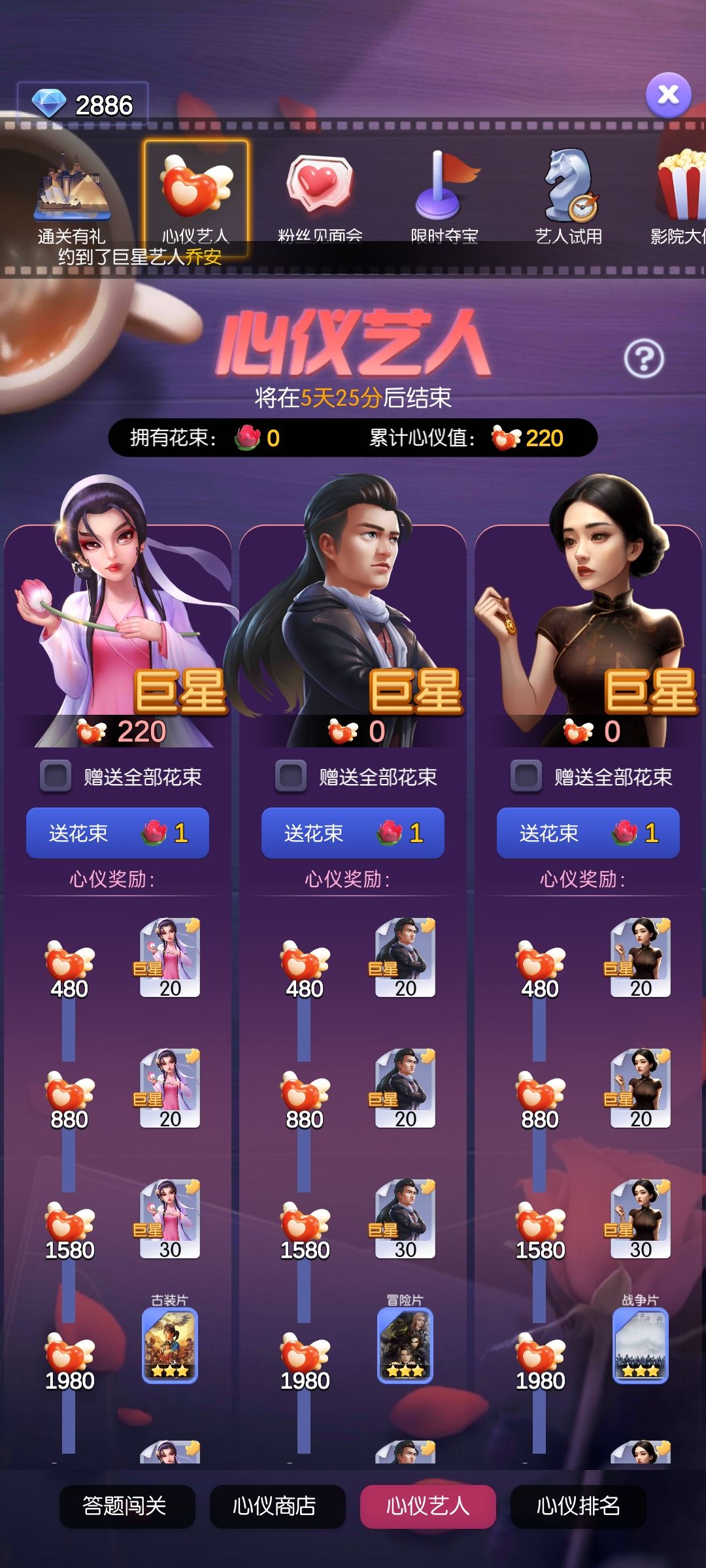 【活动时间】 8.31日-9.6日 【问题】 图中艺人在游戏内的默认名字是? 【活动奖励】 剧本收购券*1、点赞数*10000、高级星探卡*5 【回复参考】 角色id:10012345 角色名:xxxxx 【领奖方式 】 玩家在回帖后。需主动联络客服领取。 客服联系方式:关注“影业梦想家”微信公众号,点击社区攻略-联系客服即可。 【活动规则】 1、每个tap账号仅可参与1次; 2、回复需带有游戏内