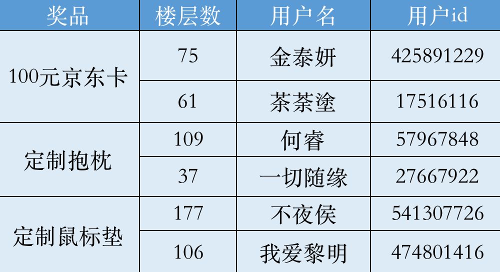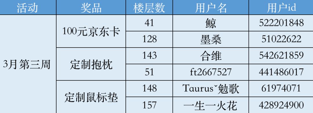 经过一个周末的洗礼,现在整个人已经处于一种困到懵逼的状态; 当代社畜的痛苦不外乎白天太长夜太短,工作日太长周末太短。 感觉黑眼圈已经蔓延到了头顶,爆米花都黑成了巧克力味。 不过好在睡了个迷迷糊糊的午觉后现在已经再次复活啦; 活过来第一件事就是给大伙开个奖乐呵一下~ 根据活动规则,截至3月14日,总回帖层数为222楼,爆爆通过随机数生成器随机抽取了六名幸运鹅,结果如下 恭喜这六名幸运鹅~ 他们对应的