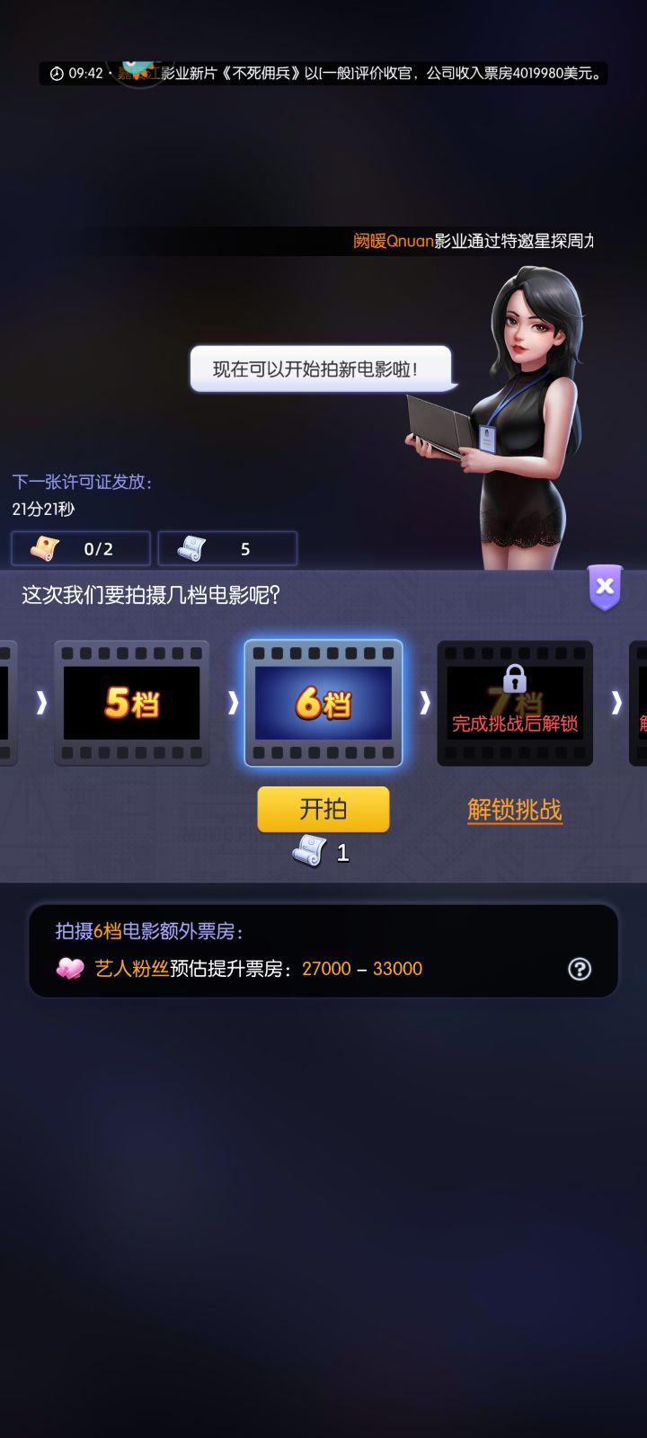 此攻略为平民攻略,有钱人请回避!1.票房方面拍电影只要可以跨入下一个档位,哪怕是C级别也可以比上一个档位电影票房高出一倍到三倍票房,勇敢挑战下一个档位,即使失败会退还所需要的的许可证。PS:(不会退回拍电影需要的美金,不过无伤大雅😆六挡之后就要慎重)2.人物方面抽卡概率为1%是巨星,平民的话只要有一个巨星就够了(优先为赛季推荐的人物),其他全部培养明星,每种电影类型都培养1—2个明星不要