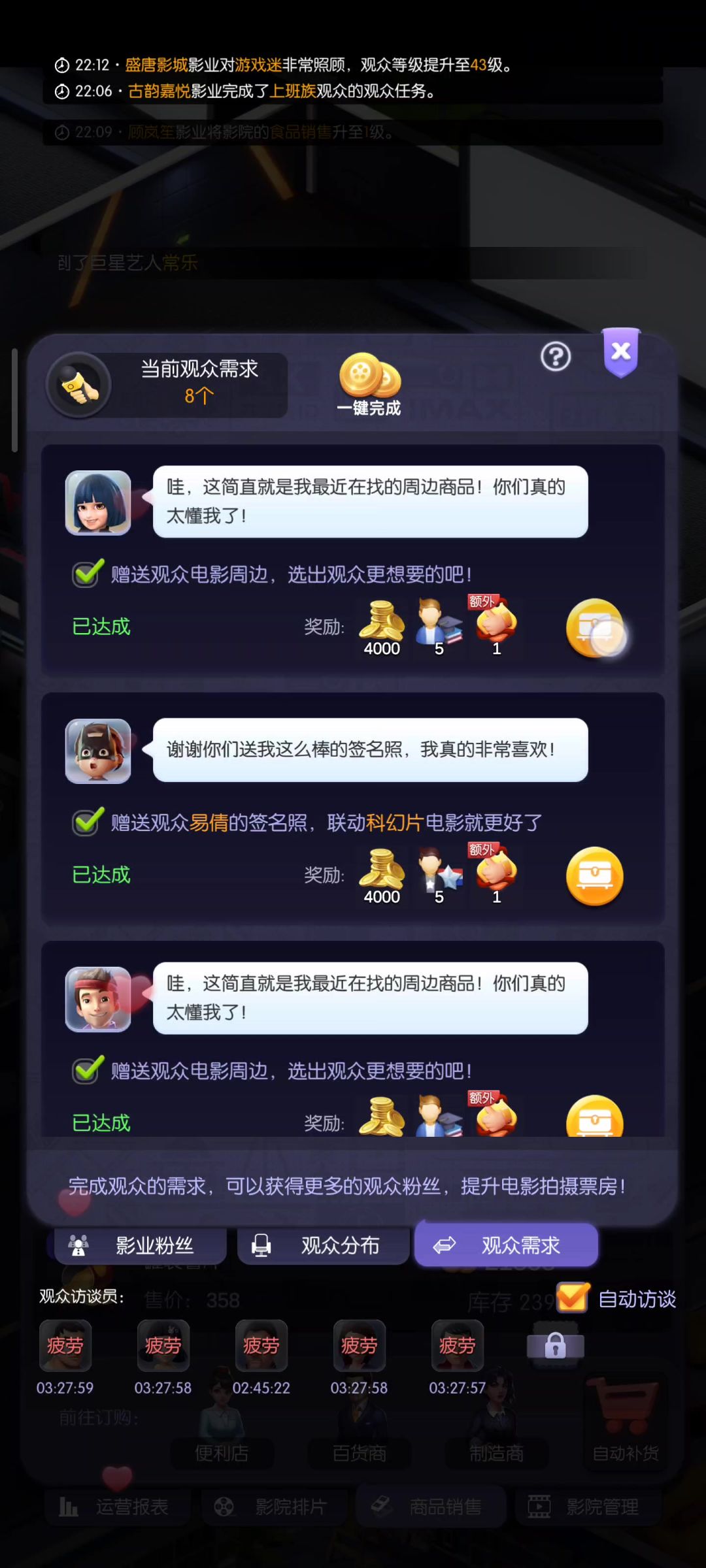 建议优化观众需求这里的交互,如视频所示,十几个观众的需求,我一个个点开满足,或者使用一键满足后,都需要一个个点击右边提交,每个提交后会弹窗出来两个界面且因为有动画并且无法点按加速或跳过,会导致特别繁琐的操作,建议优化改进此内容。 不光此处,在拍完电影最后计算票房,给加成的时候,两个加成的动画也无法加速或跳过,只能硬生生等。 还有参演功能中,参演结束领取奖励时的动画,都点击领取了,还反应慢半拍杵在那