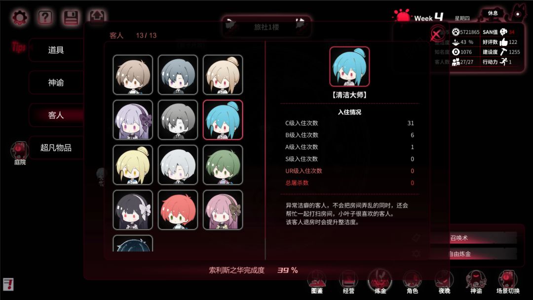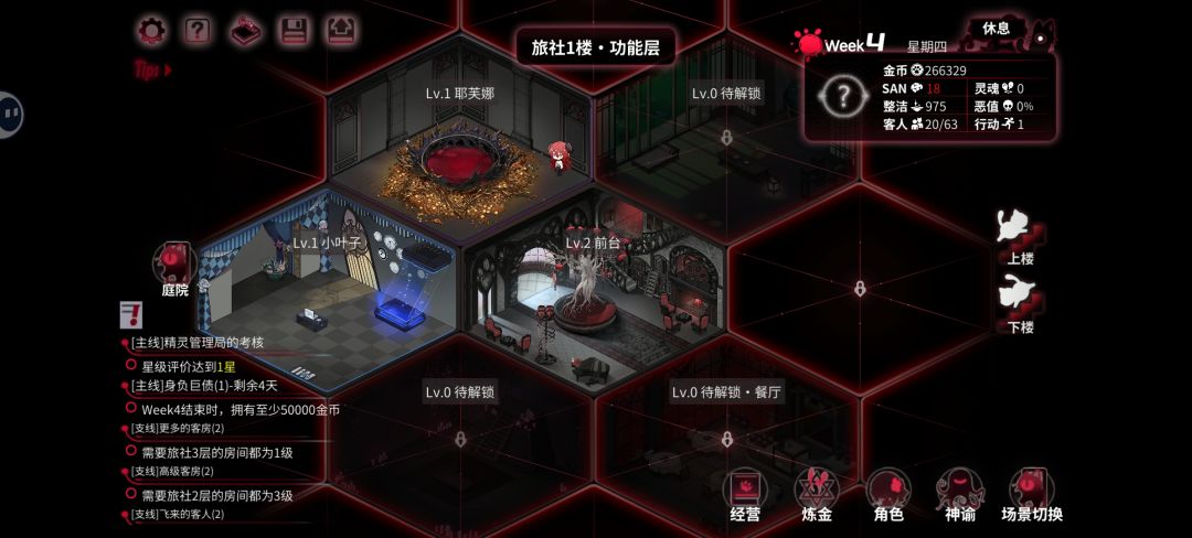 (结局没有截图)第一次想认认真真评价一个游戏,以下仅代表个人观点,顺便讲讲心得吧 总体来说,我给9分, 0.5是UI太小了,特别是烹饪食材的时候…… 0.5分是行动力…… 游戏里面比较重要的数值我认为就只有“金币”这个东西,除此之外就是整洁度,其余的无关紧要,后面我会说。 每天两点行动力,早晚各一, 先来说说房间。前期就是完成任务升级房子就行(召唤客人那个任务做不做看个人,不重要),房租是收入的一