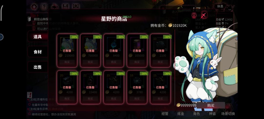 PC上全成就后,就一直等着看看移动端上不上,然后花了一小时推完了前两章,本作算是有点经营属性的gal,每天分为白天和夜晚,需要消耗行动点。面板方面会有金币,整洁,san,恶值等,核心玩法有神谕,开房子,做菜,炼金,图图,扫雷,探索等。 游戏建议多多存档,推荐的存档点位是每周周末,每月月底,以及自己干了某些重要的事(比如练了半天金),而且这游戏是有自动存档的(在存档第一页前面)。 前期行动点:比较缺