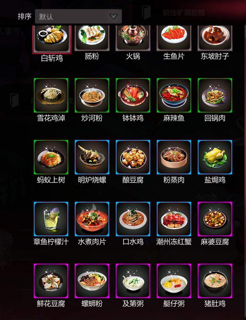 #游戏攻略 # 白色料理 1、【白斩鸡】:鸡肉 2、【肠粉】:米 3、【火锅】:奇怪的肉 4、【生鱼片】:鱼肉 5、【东坡肘子】:猪肉 绿色料理 6、【麻酱凤尾】:绿叶菜 7、【钵钵鸡】:鸡肉+辣椒 8、【雪花鸡淖】:鸡肉+奇怪的肉 9、【蚂蚁上树】:米+猪肉 10、【速食冷盘】:奇怪的肉+辣椒 11、【炒河粉】:米+奇怪的肉 12、【麻辣鱼】:鱼肉+辣椒 13、【酸菜鱼】:鱼肉+绿叶菜 14、【