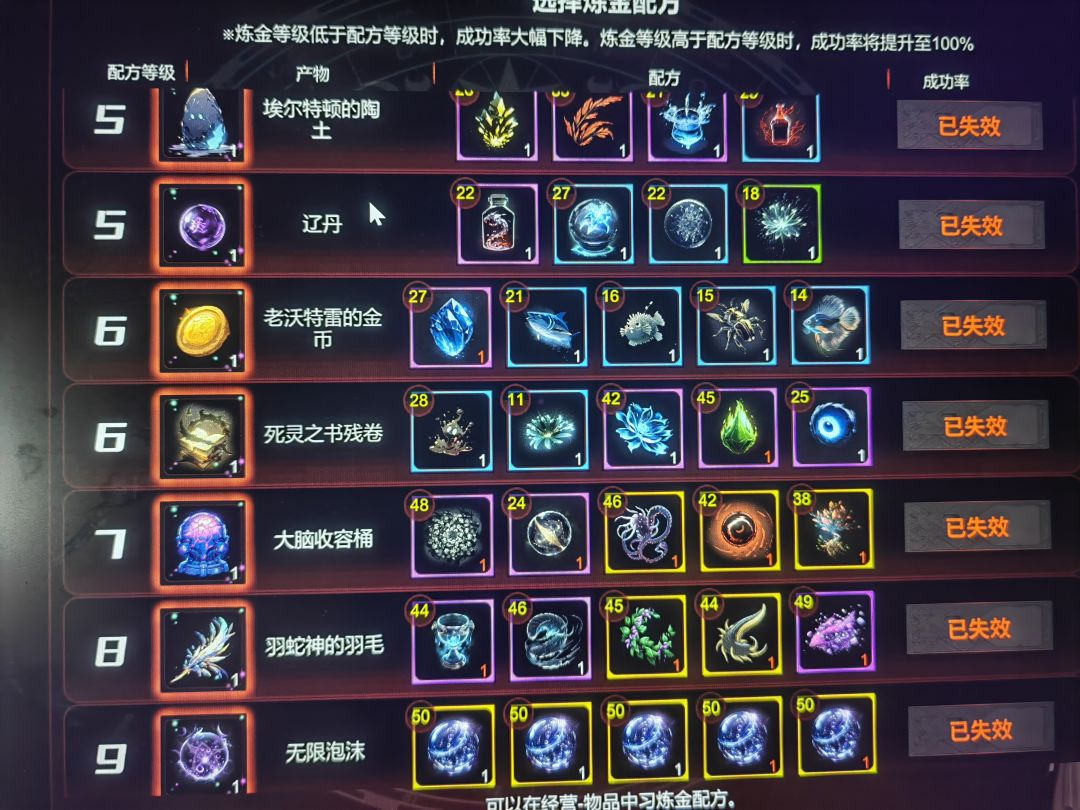 1.材料可以通过屠杀大量获取 2.自由炼金投入的炼金价值大概率可以获得等同价值的的东西或者超越 比如: 价值1硫磺+价值1硫磺=价值2宿根亚麻+价值20铁…… (十连获得的) 3.没有配方如何获得想要的材料呢? 通过2.自由炼金放置足够的价值 可以有几率歪出同等价值物品,也就是需要的东西。 (没有详细写,就当给大家提个醒) 4.不需要按照配方一个等级一个等级炼制,根据小提示2搭配价值30的炼金材料