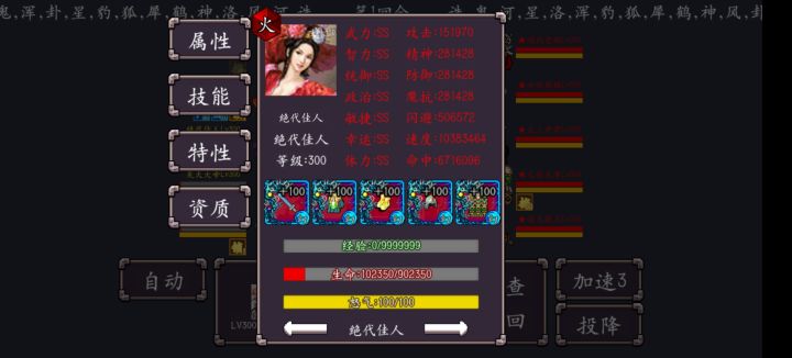 非常好玩!玩法对我来说挺新鲜的,游戏体验感很好!目前标准难度已经通关了,关键是要先手降怒,职业方面感觉好用的有白马骑、轰天神雷、龙虎天师、昊天大帝、上古祖巫、绝代佳人(需要连珠附魔),强烈推荐战神特性,神清、神怒以及带百分比加成的特性都挺好用的,前中期工具特性化灵、神狩、砺伍、神度、学霸、鉴龙、敌国、屯田、飞天非常有用,后期神狩(刷券买龙珠)、飞天有用(偶尔用一下神度,砺伍),龙珠重复许愿我想一夜暴富,把钱刷到万亿亿,1万亿亿左右可以把一件装备强化到100级,我的绝代佳人3件速度装,打项羽血压到10万左右,战神特性全阵法加持下速度1000多万,比对面速度快,基本随便打,期待作者下一部佳作!!!