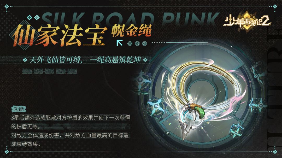 本是太上老君一根勒袍的腰带,因常年收束丹衣而沾染金丹灵气,遂具神通。 又在那八卦阴阳炉火之烘炼下变得坚韧不摧,具千钧之力,缚天地万灵。 一切依松紧绳咒肆意变化,即便天仙被束亦不可逃脱。 [天外飞仙皆可缚,一绳高悬镇乾坤] ———————————————————— ▶▶点击下载,即刻西行◀◀ 哔哩哔哩: 微信公众号:少年西游记2 QQ3群:805848374 QQ4群:954854182 官方充值,