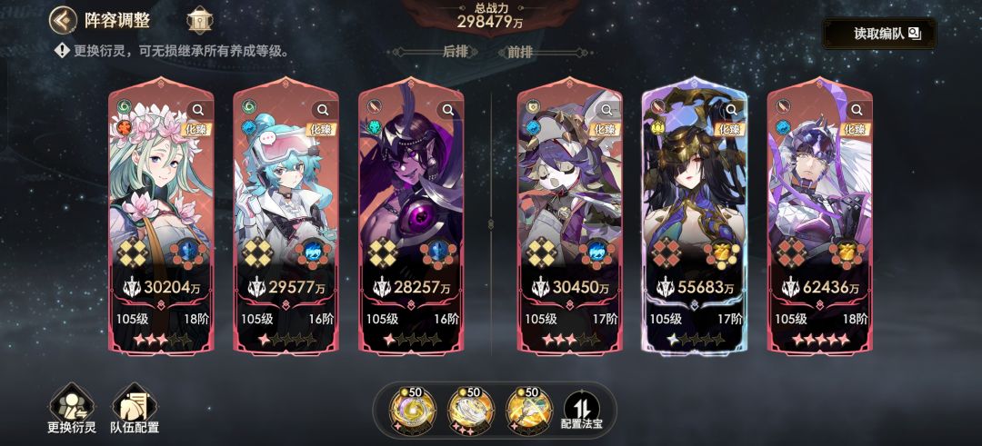 目前版本来说主流阵容可以分成三种。 1.一回合爆发队 辅助角色:玉女,白骨精,妙音鸟,嫦娥,杨玉环 核心输出:太平公主,锦郭,李白,孙悟空,南天王,白居易 关键法宝:满星筋斗云 阵容分析:白骨精妙音鸟嫦娥的连携能提供大量的增伤,玉女能传导输出减抗爆,杨玉环减伤传导。李白配筋斗云切后排轻轻松松,郭锦配筋斗云开局两次切前排,孙悟空被动加攻击力附带真伤,白居易叠满怒气三次输出伤害爆表,南天王配筋斗云开局