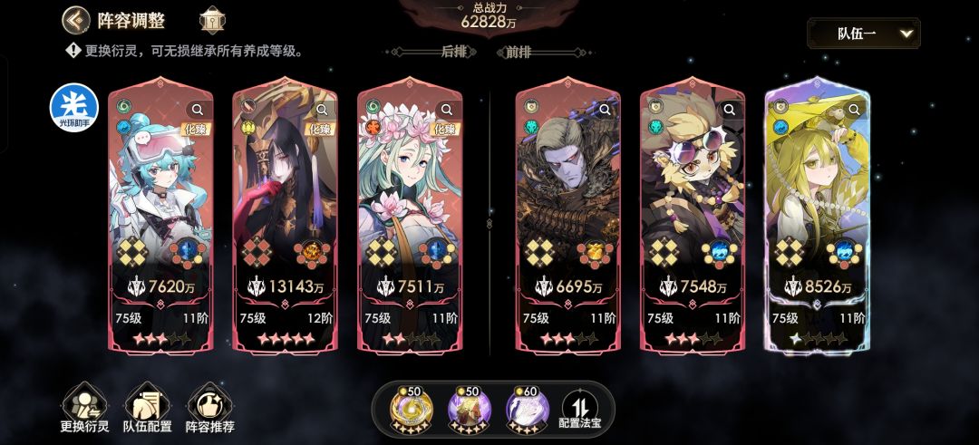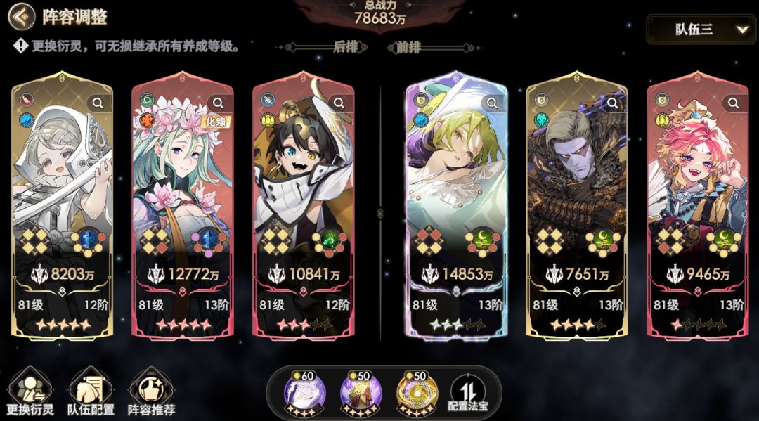 前排 南方 黄狮 牛魔三个羁绊连携前排巨肉 后排 百花 地藏 孟婆两个奶稳定回血 思路:百花给前排➕15减伤,牛魔给三个肉➕15减伤,再加上自己羁绊的减伤,基本上没几个刮得动的,经过测试打普通的地藏猴子队,基本上能越1亿战(事实上我测试打修罗能稳定越一个比我高1.5亿的地藏猴子队,上图是我同区的榜一,比我高接近1.4亿,用这个阵容跟他五五开)。这个阵容越战的前提是对面的爆发不足以秒掉前排,然后通过