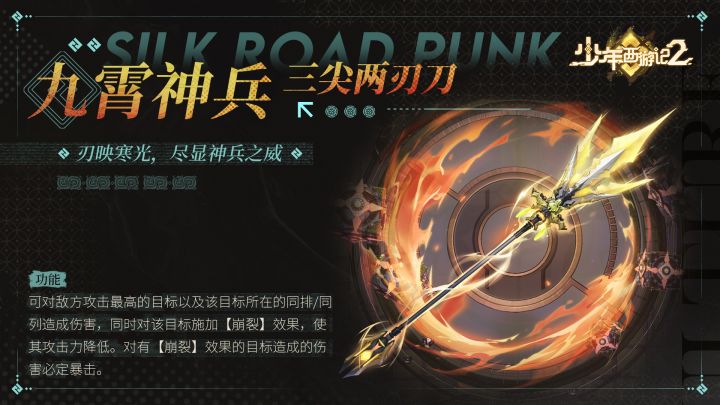三尖两刃刀,乃是二郎真君降服三首蛟龙所得。蛟龙化作利刃,刀身挥动,如同海啸龙吟,令人闻风丧胆。刀刃之上,冷冽寒光闪烁,拥有割裂虚空,斩断世间一切魔衍的力量。锋芒所至,一击皆斩,就连敌人的铠甲都如同薄纸一般被瞬间撕裂。大闹天宫后,真君奉玉帝之命捉拿弼马温:“小小妖猴速速就擒,免得成为我刀下亡魂!”【刃映寒光,尽显神兵之威】————————————————————▶▶点击下载,即刻西行