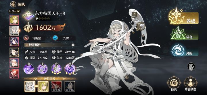 最正统的女团来拉!靠韧性拖回合打输出,一磨一个超时赛,原汁原味!继单拉持国后,拐了个嫦娥,明天靠送的就能五觉了,后面试着四天王,但是灵核压力确实大,就不好推荐大伙这么转型,后面我发现可以尝试传统的双奶双c,1t的女团!郭瑾的溢出能量,可以让他前三回合都能放大(五觉情况下,一觉也能前俩回合开大)持国和多闻都有回能,基本从第二回合开始可以连续技能,配合飞天的回能被动就能完美触发给双奶,一般三回合必