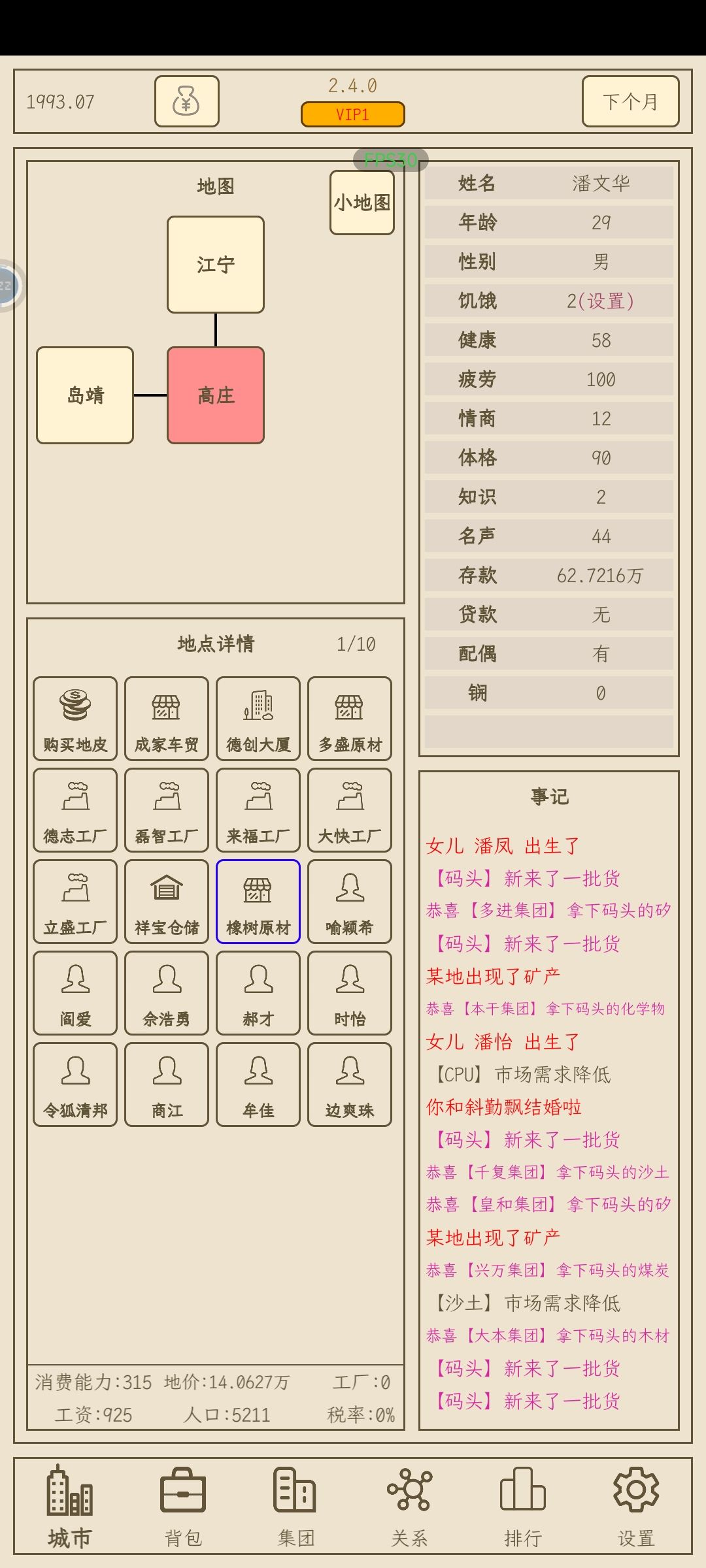 开局必须要做的是选开局! 什么是选开局,就是没有达到我们开局条件的情况就重开一局! 主打无广告开局,条件都要满足! 第一要看橡树的价格,在背包,料料,向下拉找到橡树,价格要在11块以上! 第二要看买块的价格,要在110万以下。 以上两个满足就可以进行后面的操作!不满足请重开一局! 第三,买一块工厂地,买一个材料店铺。 第四,工厂地买一块农田!记住是一块农田!选生产橡树!招人之前先保存!招满人效率要