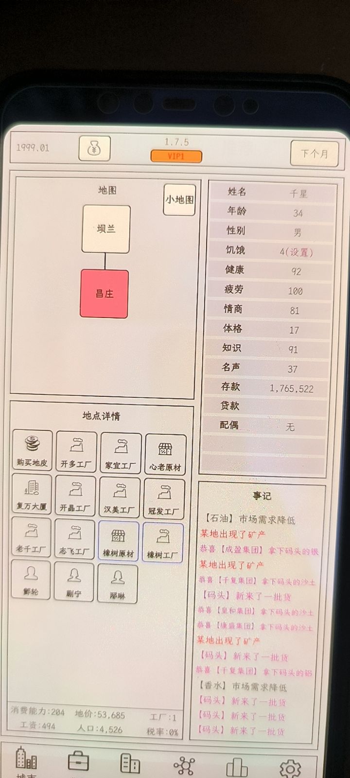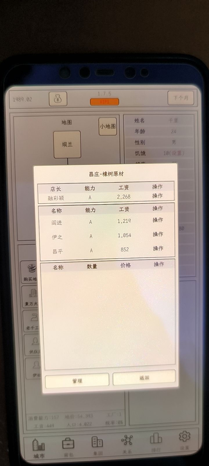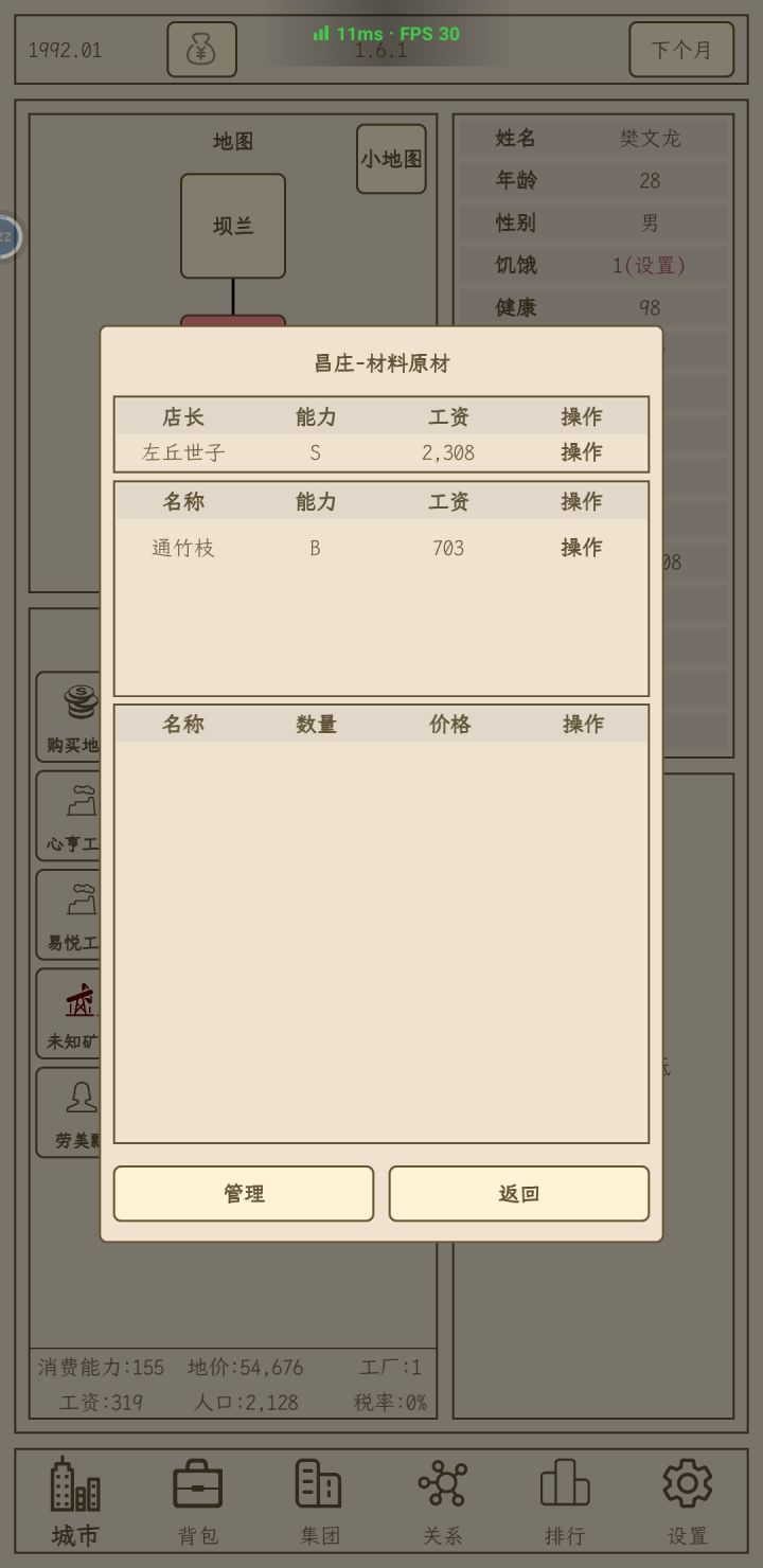 Tips:1.为什么采购不了东西——不同于小小1,采购需要AI卖不出去才有几率采购到2.为什么卖不出去——和城市的人口有关,人口决定了该城市的消费数量上限,可以通过去其他城市开分店开提高消费数量的上限3.为什么寿终正寝后游戏结束——游戏需要结婚生子,必须有男性继承人选择才能继续游戏4.游戏该怎么玩——非广告党开局买一个工厂购买农田生产橡树和一个材料超市,要致富,先撸树,慢慢赚钱扩大生产线,