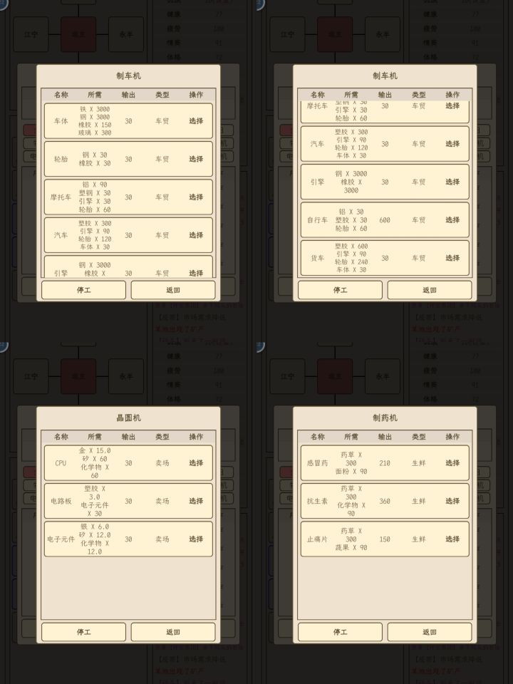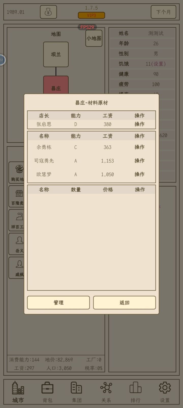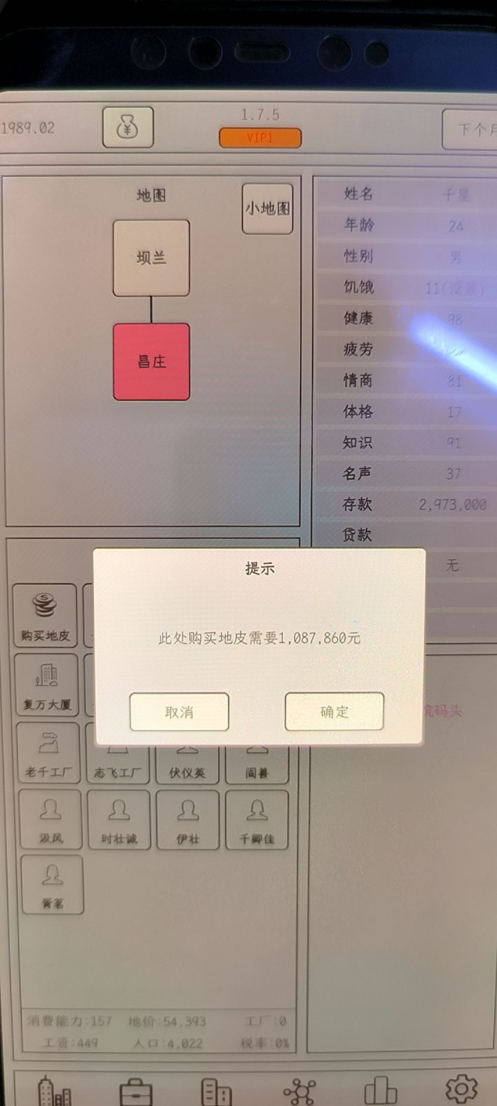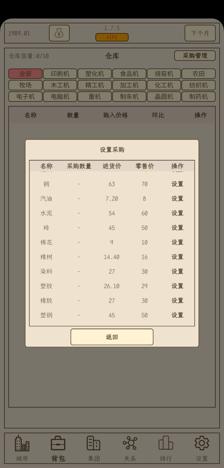 Tips:1.为什么采购不了东西——不同于小小1,采购需要AI卖不出去才有几率采购到2.为什么卖不出去——和城市的人口有关,人口决定了该城市的消费数量上限,可以通过去其他城市开分店开提高消费数量的上限3.为什么寿终正寝后游戏结束——游戏需要结婚生子,必须有男性继承人选择才能继续游戏4.游戏该怎么玩——非广告党开局买一个工厂购买农田生产橡树和一个材料超市,要致富,先撸树,慢慢赚钱扩大生产线,