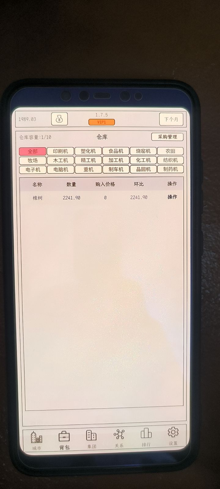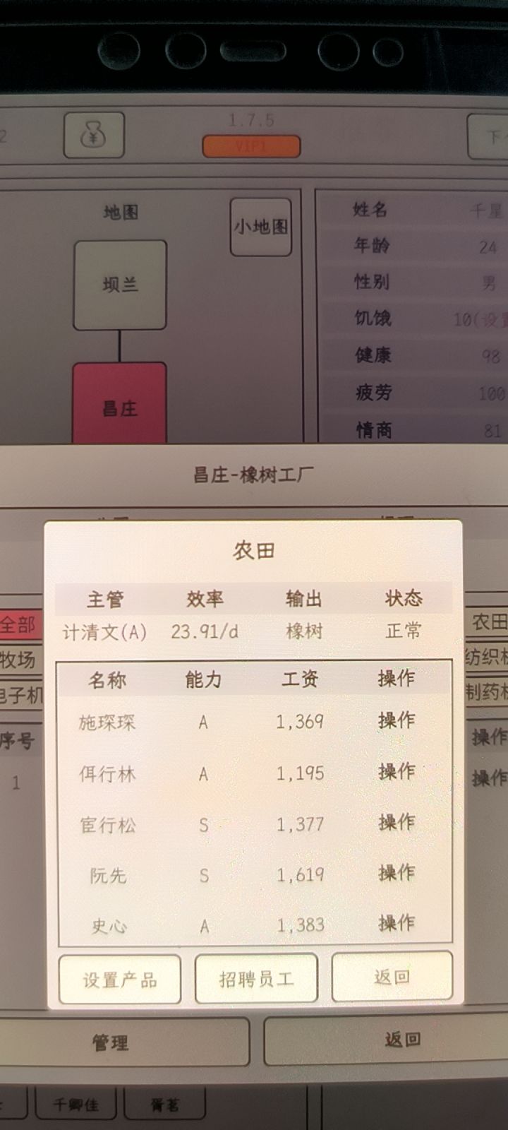 开局正常刷地价,刷橡树价格11,大概十几次吧刷好。员工为不看广告的情况下不算太差的属性。下面两图为一回合后的库存和存款下面两图为存款变负时的库存和存款现在,我们开始算账,角色在最低伙食标准(3000)这个我们忽略,毕竟拿几百万创业,最差的伙食总得养的起自己。全程我们不卖东西一回合基本资产 361922+850.5*11=371 277.5存款变负时基本资产 30618*11-5808