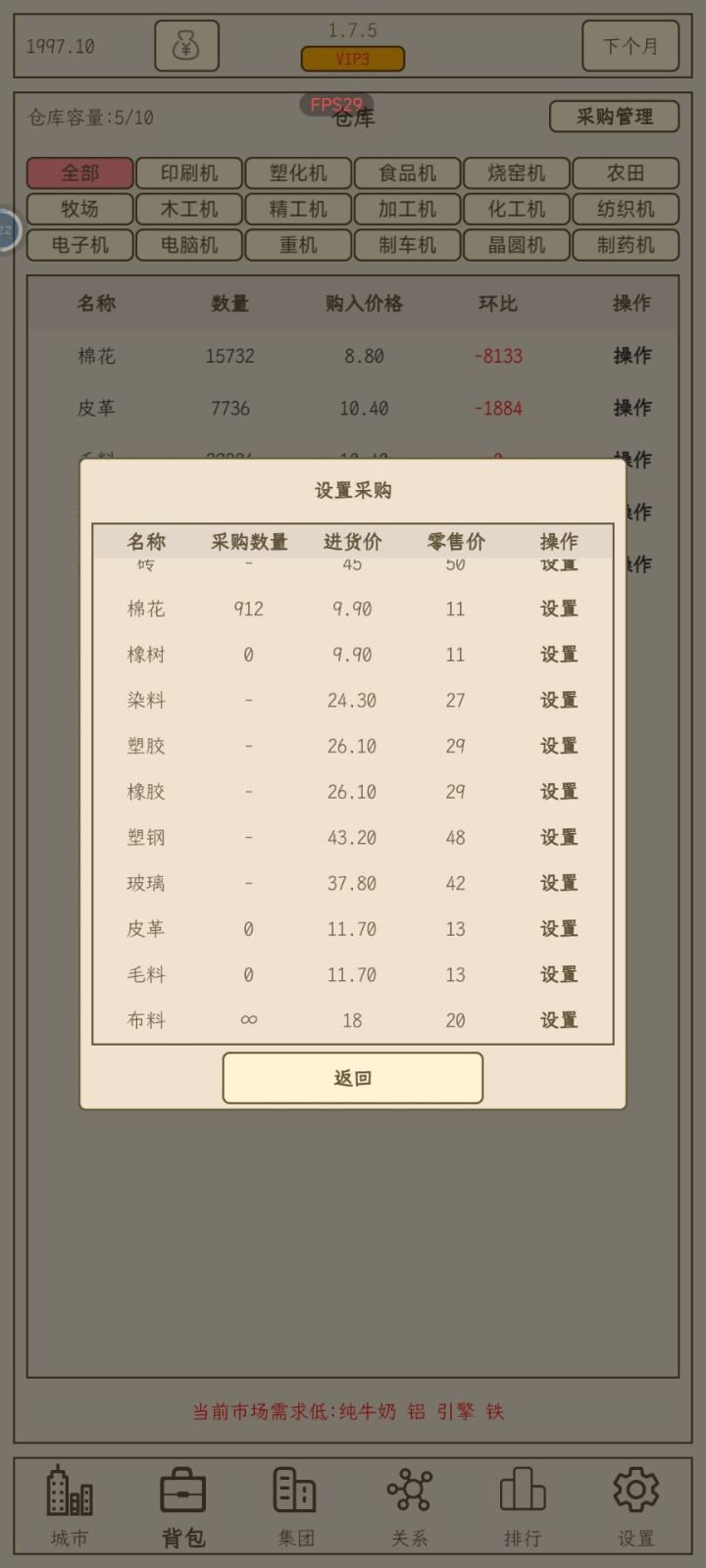 我之前整了一个攻略,当时贴的是广告员工,十有八九有杠精会拿着这个说事。我在群里也说了这种方法,并且做了实验,天夜明也尝试了。就别叭叭了,我是提供玩法,不是跟你们装逼吵架来的。具体思路:棉花、橡树、皮革、毛料、布料有计划的倒卖,考虑到前期本金低,偷懒无限采购,会出现跟橡树流一样的挨饿情况(减寿所以不喜欢),等有一定基础后,部分商品可以点个无限采购。盈利情况:可以看到买了块地,还没招收员工