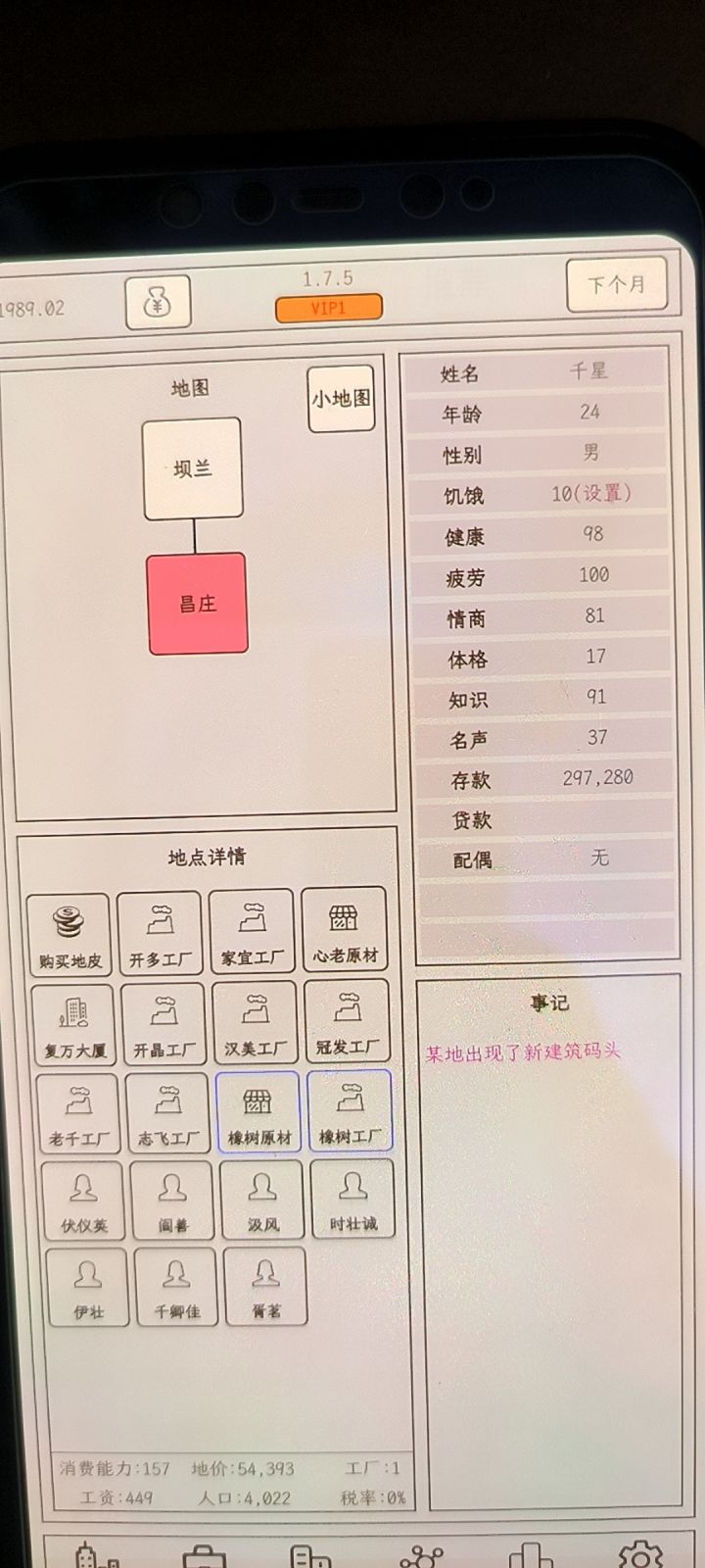 我个人挺喜欢这类游戏的,评分上不去的原因有三。1.这游戏没明细,事记那里,要不是每隔几个月会出个矿产,每次点下一个月几乎都没变化,新手一般不会看那些背包的数据啥的,不如增加一些明细,有点变化,有点代入感,就是写出每个月进货了多少什么,什么工厂做了多少什么,这样子会好一些,不想看的老手也可以点个隐藏普通事记之类的。2.人物关系怎么弄都结交不了,不知道是不是我自己问题,我每次和别人交谈n次,都结交