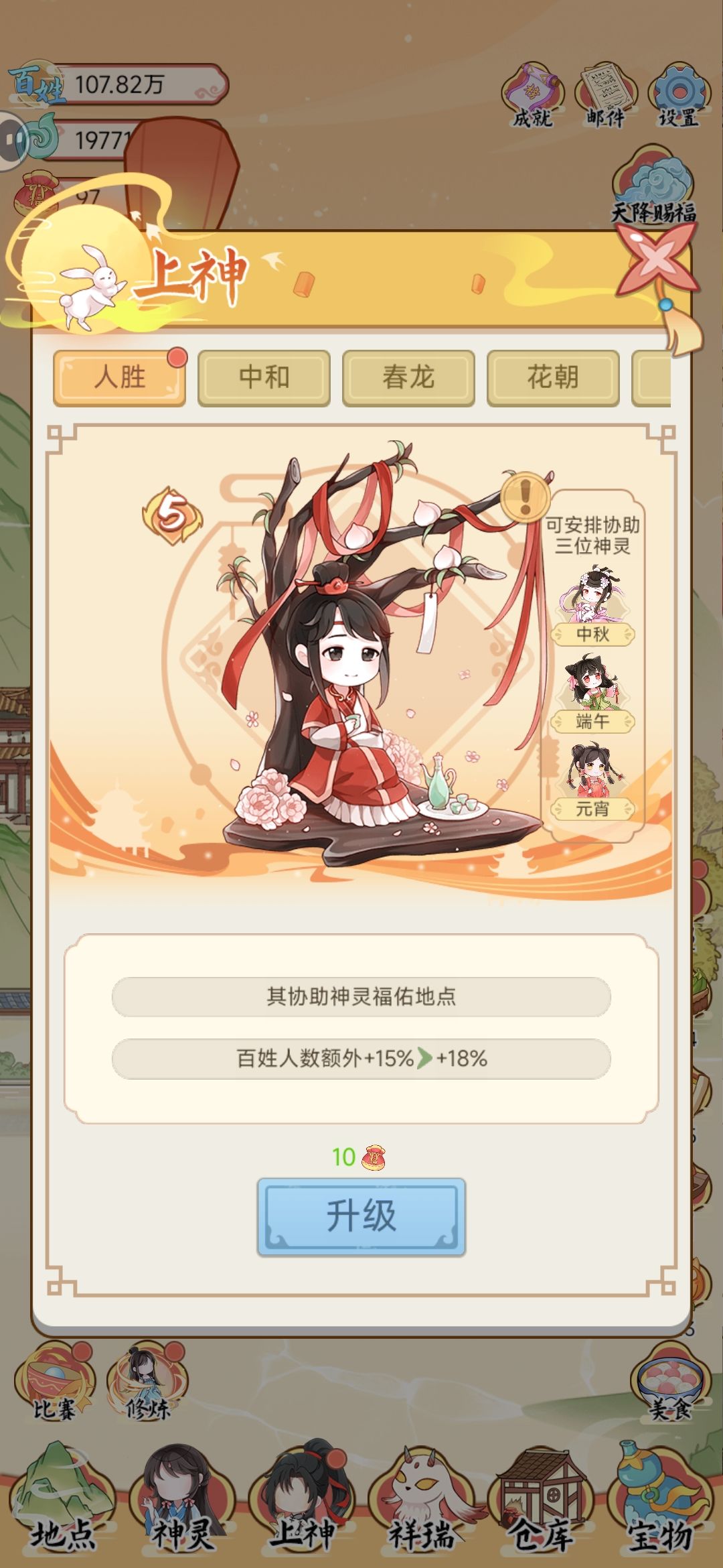 一~催更,游戏内容已完成 二~攻略 1、总结最不重要的百姓和灵气,最重要的游历(确切的说是五色花) 2、求签随机性很大,唯一需要的是求签的上上卦(直接给宝物) 3、挑战的答案都在简介里有时间看看 4、最重要的游历,不需要多长时间神灵数量就满了和游历地点数量一致,所以直接随机游历就好 三~建议 1、天降好运,只给百姓和灵气,真没用的,这个广告比较鸡肋 2、灯笼也一样更没用的 3、召唤祥瑞,增加值太少