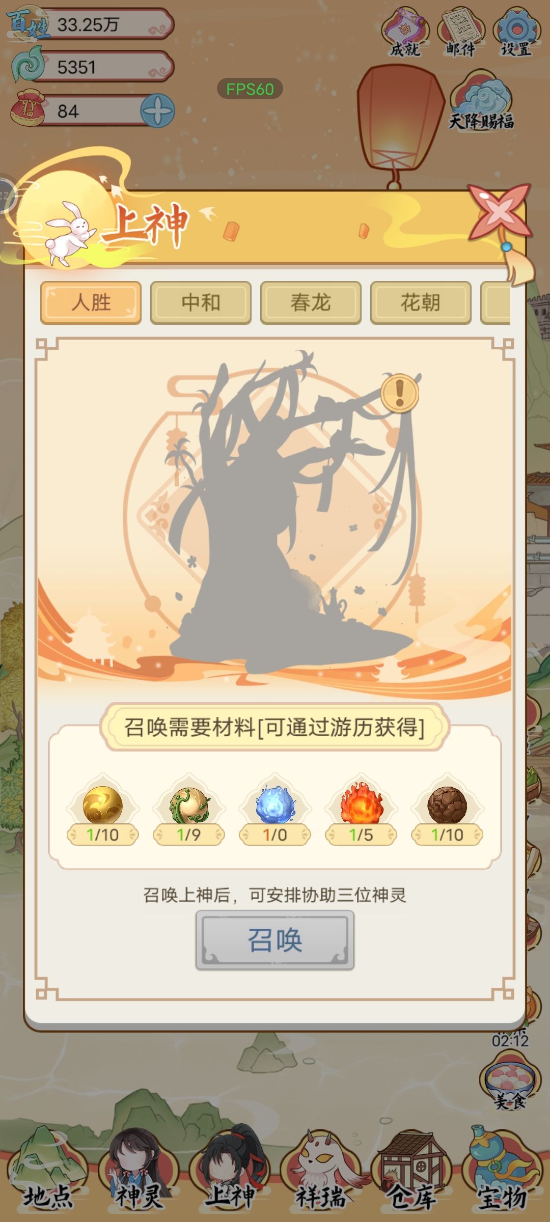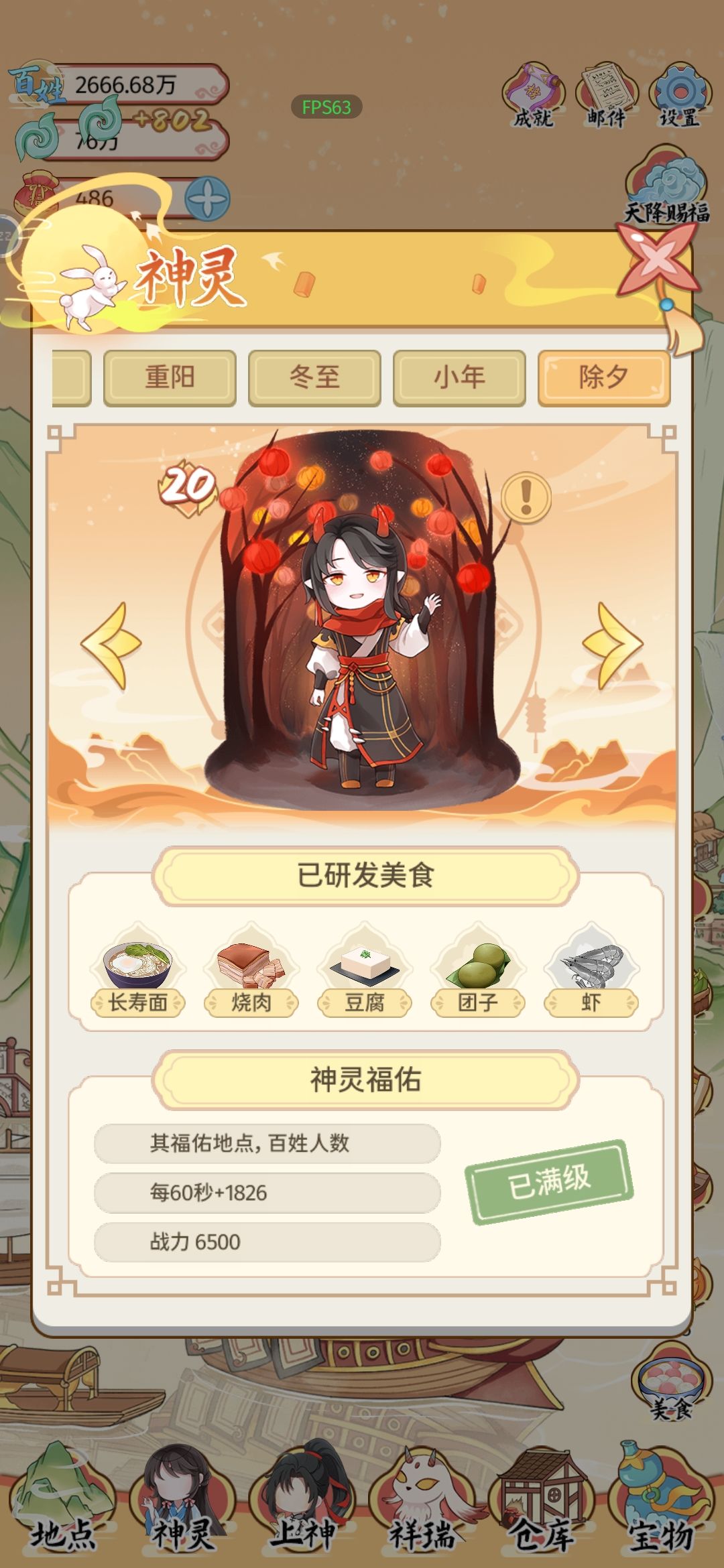 一~催更,游戏内容已完成 二~攻略 1、总结最不重要的百姓和灵气,最重要的游历(确切的说是五色花) 2、求签随机性很大,唯一需要的是求签的上上卦(直接给宝物) 3、挑战的答案都在简介里有时间看看 4、最重要的游历,不需要多长时间神灵数量就满了和游历地点数量一致,所以直接随机游历就好 三~建议 1、天降好运,只给百姓和灵气,真没用的,这个广告比较鸡肋 2、灯笼也一样更没用的 3、召唤祥瑞,增加值太少