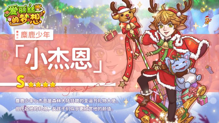 叮铃铃叮铃铃~欢快的铃铛声传来了,森林大陆的圣诞节礼物大使已经蓄势待发,预备给大家带来满意的礼物,店长们快来了解这位超受欢迎的圣诞大使!全新S级店员麋鹿少年“小杰恩”闪亮登场森林大陆的人们特聘麋鹿少年小杰恩为圣诞节礼物大使,因此,只有在圣诞节快要来临的时候,人们才能窥探到他的踪迹。不过比起小杰恩为大家带来的礼物,许多女孩似乎更欣赏他的颜值,毕竟这样一位英俊的礼物大使可太少见了。店长们快
