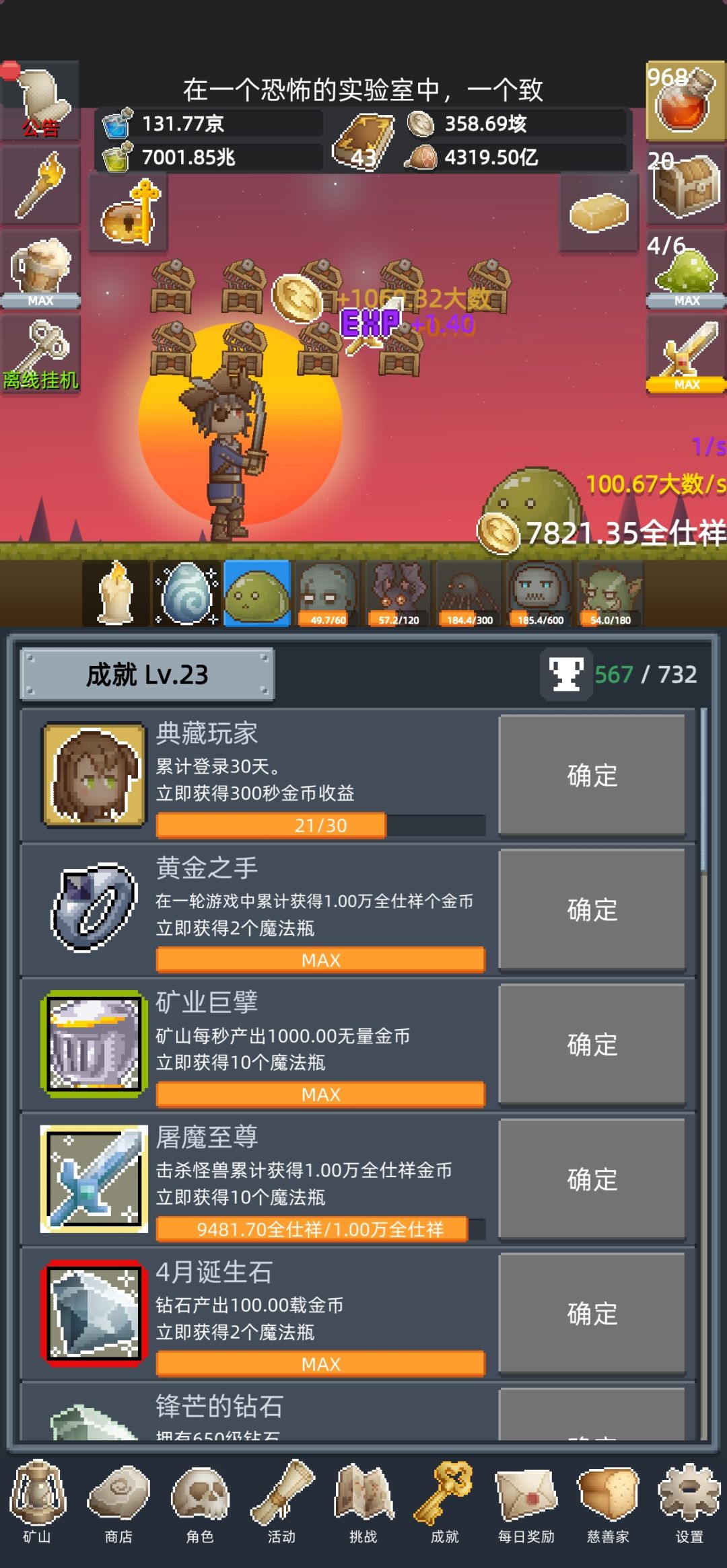 玩的最久的一个挂机游戏了,不是很枯燥,也不是很肝,比较不错。 前期一定要学会用狂欢时间+恶魔之眼+宝箱怪冲金币,中期一定要把节日以及保存轮回之前获得的道具一起解锁,不要单独去解锁节日,浪费币。后期就随便玩了,币到垓就算是进入后期了,慢慢解锁节日的道具,然后不断轮回。#游戏推荐