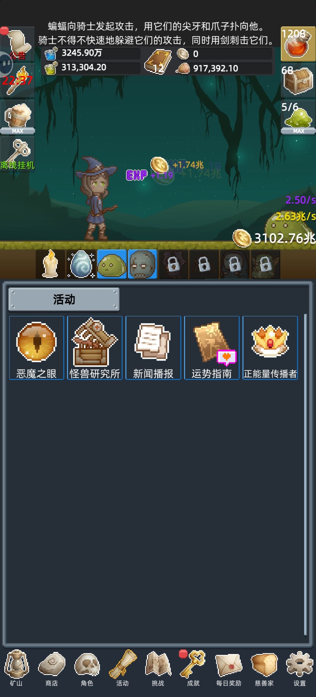 在体验了两个月,终于明白了一点,下面给新手的一些建议。 1、魔法币先把怪物(图二)开了,前期能快速的获得魔法币,不要去点挂机的那一边,有了多余的魔法币在去点。 2、当积累了一定的魔法币时,就要去点节日(图三),因为节日在中期的加成最高,可以跟快速获得魔法币。在把突袭点了(图三),然后在靠狂欢时刻和噩梦之眼来快速获得魔法币。(这里有个小技巧在狂欢时刻的20秒,可以挂后台大概3分钟,噩梦之眼会刷新