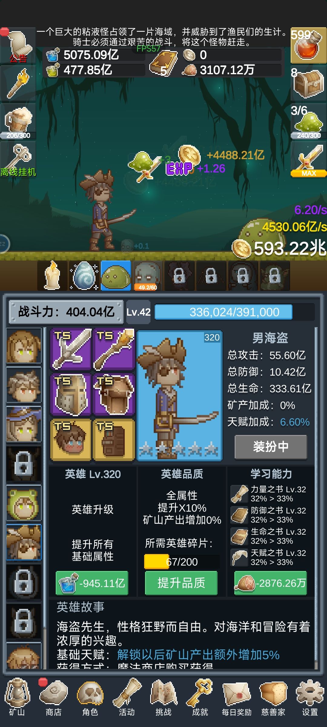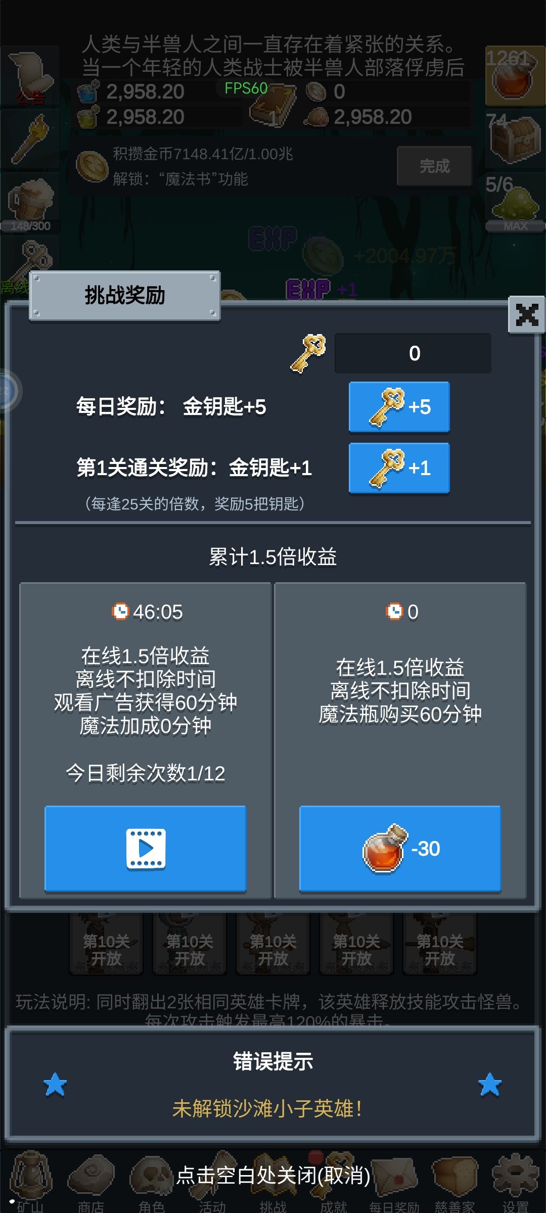 首先,想快速启动的看官方兑换码合集,可以大幅加快开局(佛系的可以签到3天) 全部换完后有不少魔法瓶,如果你是肝帝且不介意每天多看几个广告,可以先换右上角1000的冰雪女孩和100的青蛙,这两一个加经验一个是最便宜的英雄,可以大幅加快前期升级和推挑战速度,我花了3天就又买下了沙滩和海盗,有充足时间肝的还能更快,我每天时间没有到夸张的地步,转生都没怎么转,摸鱼的时候顺手肝的 如果是佛系玩家懒得打挑战就