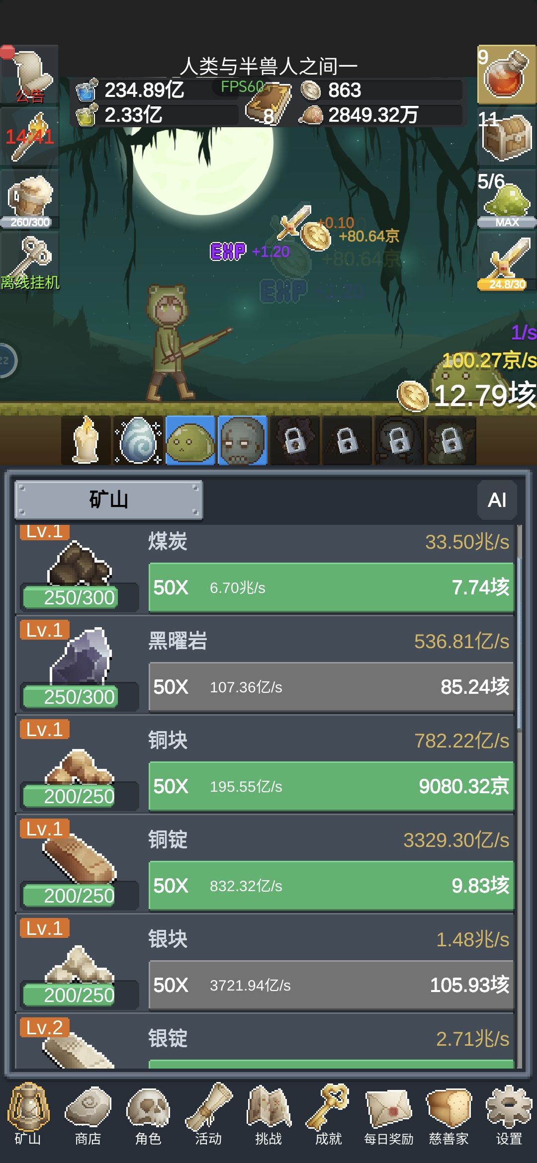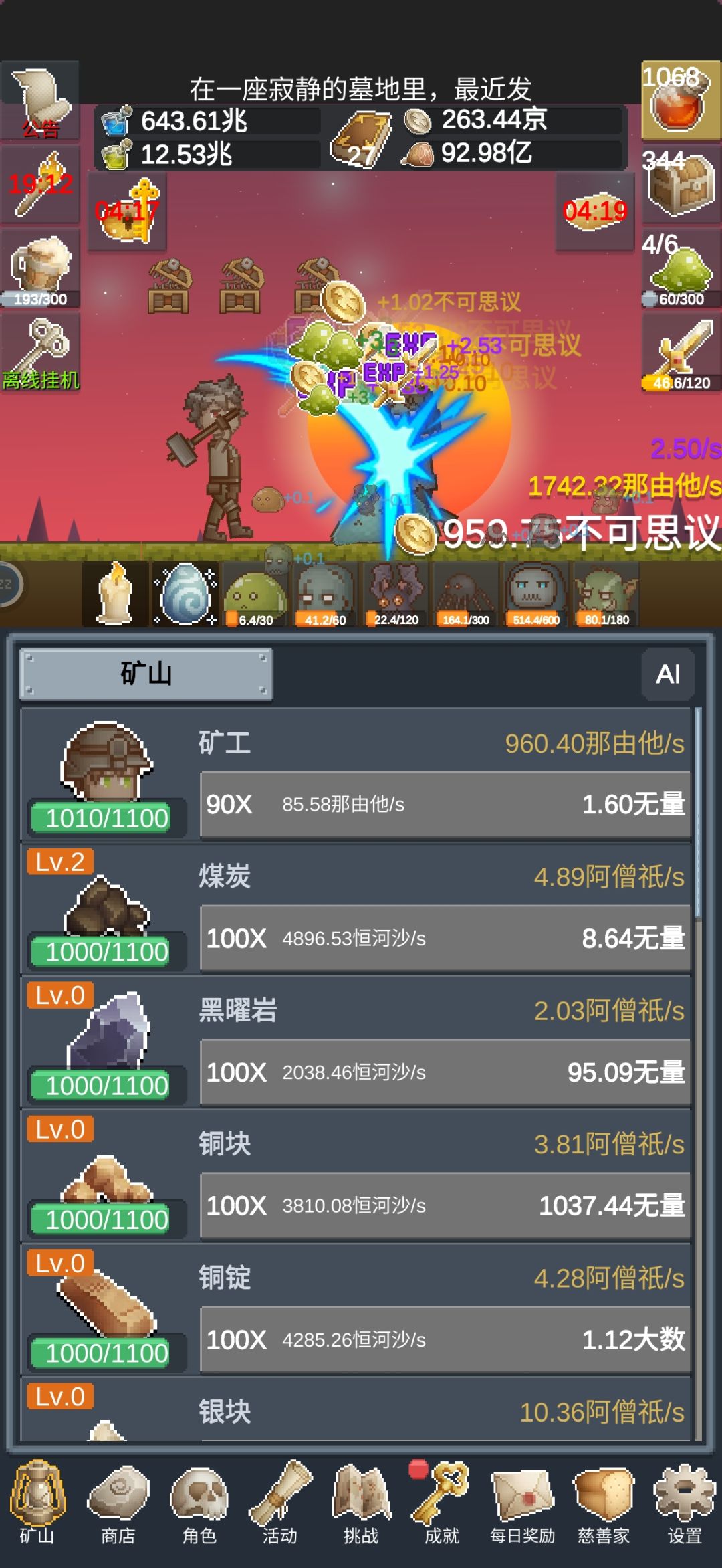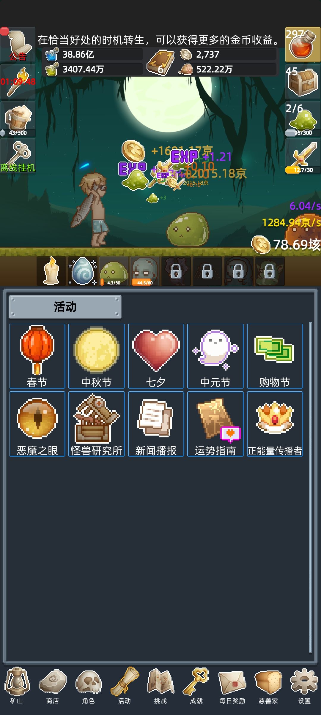 三天就通关了,只剩下加矿等级的没有点了! 转生建议:两次到三次10倍宝箱怪就可以转生了; 魔法书点击:1.点出几个食物; 2.宝箱怪加成; 3.点出恶魔钥匙; 4.点出黄油; 5.点出春节;