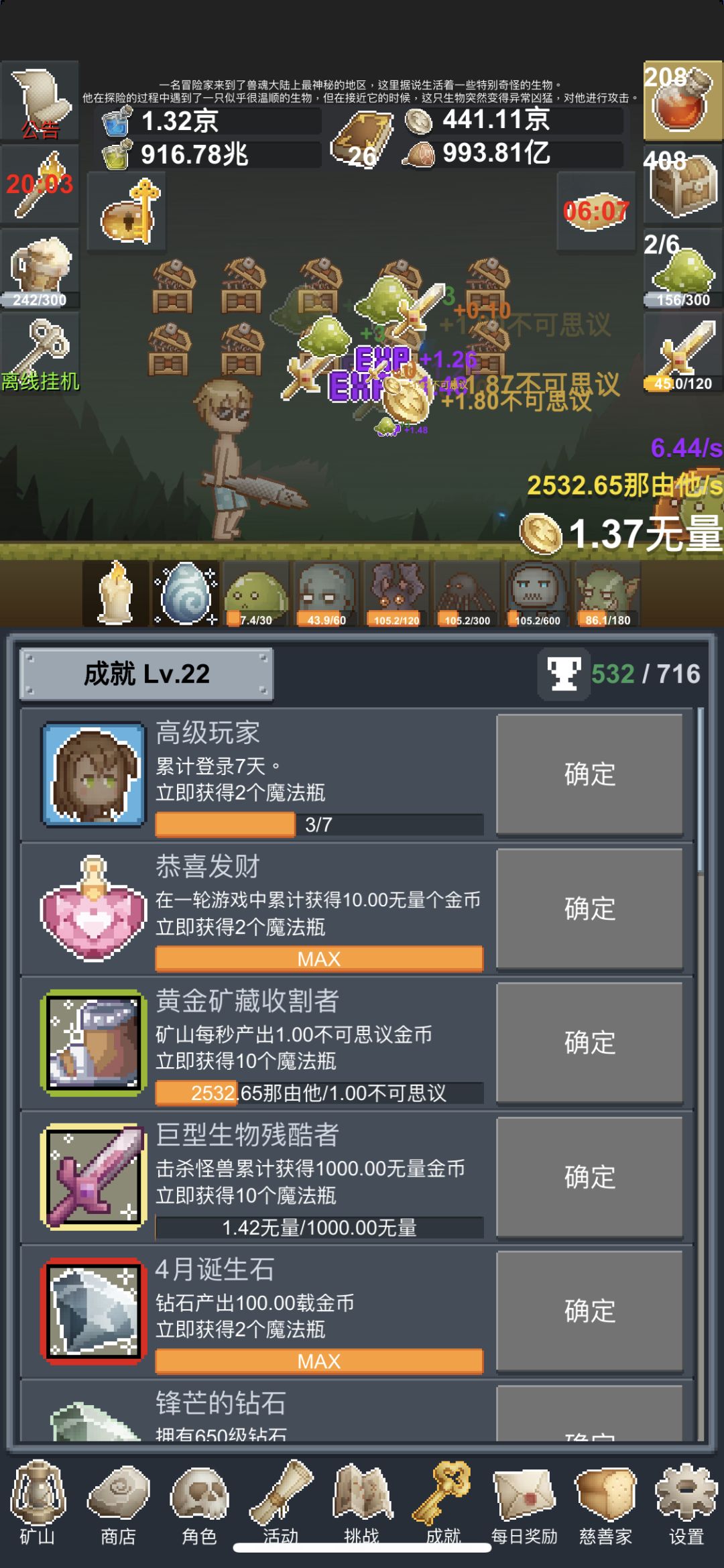 玩一遍到转生就知道是啥玩法了.核心就是利用好狂欢时刻的持续时间叠加上第6次的宝箱怪再叠加上10魔法瓶的15分钟收益,同时不断的开新矿开新矿比增加旧矿的数量性价比更高,等金币高了再回头了花零头增加数量就行.这样的话,不用看多少广告就能达到第一次转生.我是看了很多广告才突然醒悟的.后面的转生就看自己有没有兴趣玩了,基本就是重复这个模式.看点广告无伤大雅,转生一次我就卸了,还行吧.后面的模式也就那样了
