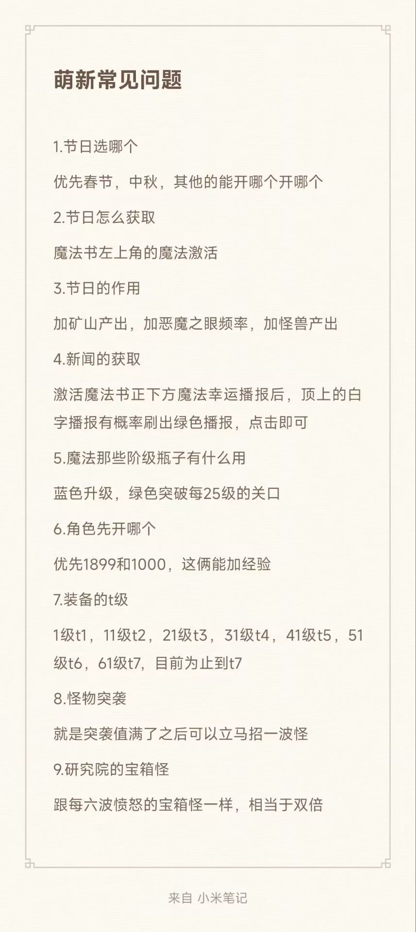 前期每次感觉升不动了就可以转,不要硬拖,没必要,基本流程就是等狂欢MAX,等6次怪兽突袭满,然后等恶魔之眼出现不着急点,先吃狂欢加成,在吃怪兽加成,在点恶魔之眼,如果后期商店有获得1小时资源出现,同理,在一个时间点集中最大值吃,魔法书没什么好讲的,前期主要是要矿山产量资源为主,其他的有什么点什么,节日点后优先点节日保留,不然每次都要重新刷很慢,有点上头,但是基本上两三天就能玩的差不多
