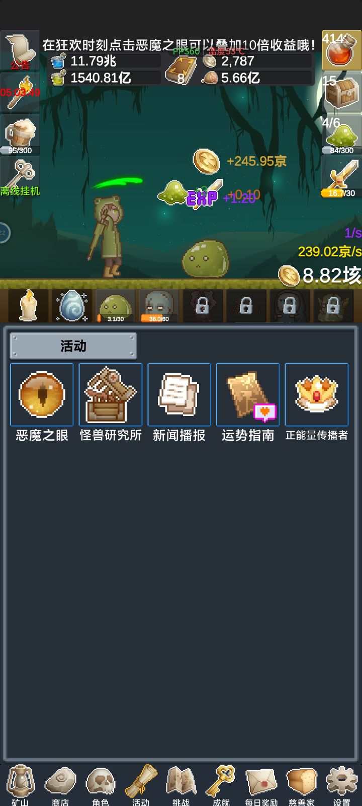 1. 听说这里有怪兽|矿山满级,魔法书满点,准备迎战!2. 挂机党的快乐:离线也收金,打怪不费力!3. 点满魔法书的瞬间,觉得没有打不过的怪兽~