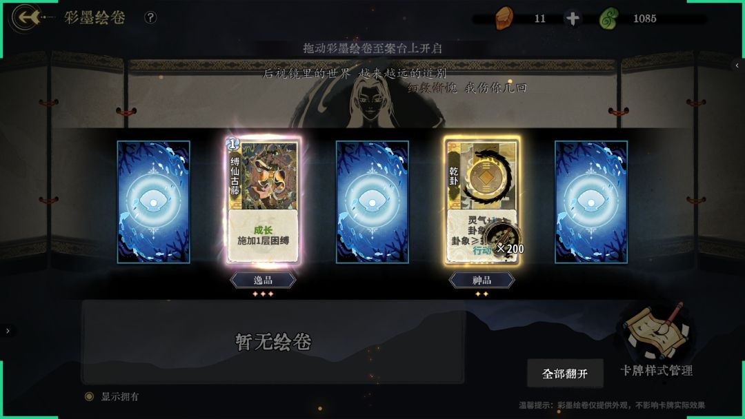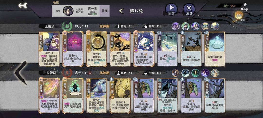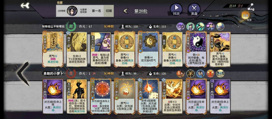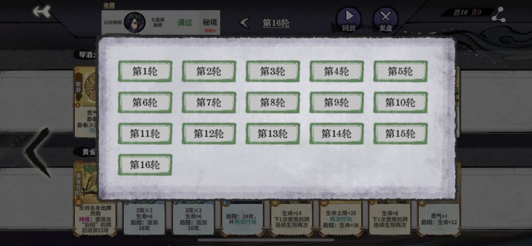 16局对局附图上传评论区!!!!!! 前中期无脑选修为增加的机遇,如吞噬异鲲→逃走;三个颜色选择黑色;获得牌或者修为+1肯定选修为,减换牌次数也值得;四次进阶只有第三次的瞒天过海是必选,其他都以先天卦和修为为主,没有先天卦就选修为。 前期随便打,进阶金丹后开始刷牌,主要为了海底捞月和螳螂捕蝉两张能用到通关蓝卡,其他四张就是兑卦、众星捞月、星羿.打和副职的以画入道(这张牌化神期再用必出金牌) 更新