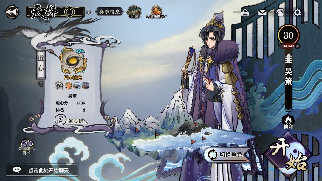昨天用无策上了道尊。现在排名道心榜第九。总共打了76把,25把第一,前四是57。我在4500左右走了弯路,徘徊了20多把。后期理顺思路以后,30把就上到道尊了,场均能上50分。 感觉这个角色还是比较轮椅的,今天给大家分享一点心得。 首先是仙命选择,除了筑基和化神选自带仙命以外,其他仙命的第一优先级全部抢修位。如果实在没有修为的话,金丹可以选择自带,元婴的话可以选择加换牌次数或者加生命上限的。 道韵
