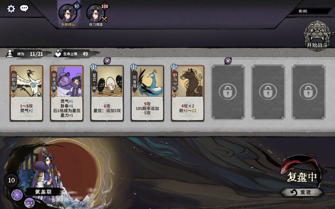 星位:默认第三,第六牌位 星力:给星位牌加攻击 卦象:取最大值,百分百概率 灵气:灵气牌耗费的费用 资源卡:加星力,卦象,灵气的牌 战斗卡:有攻击输出的牌 后一格成为星位:字面意思,如果后一格已经是星位加一灵气 #======================= 对阵首轮只有3张牌,多一场多一张牌,最多上阵8张牌 (第6轮满格) 吴策初始40血,手头3张牌,战斗一般2轮内决出胜败 也就是你要一轮3张